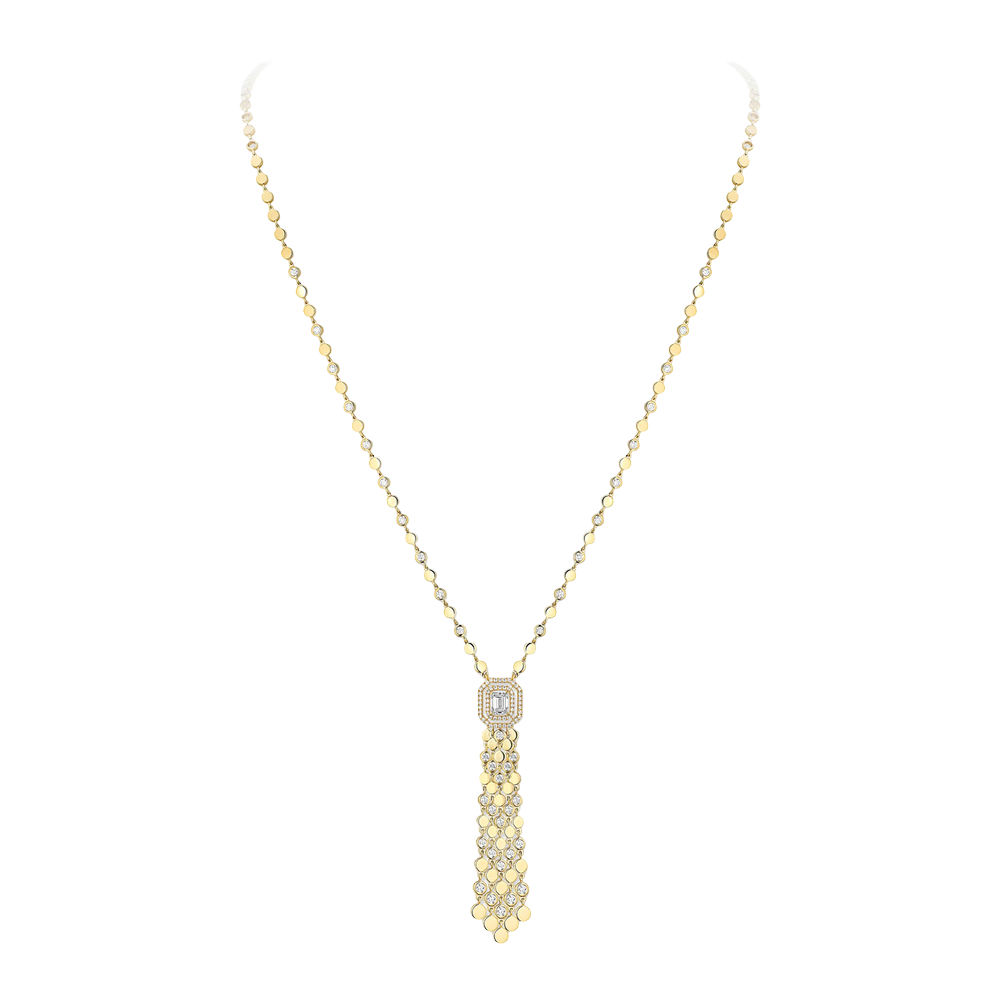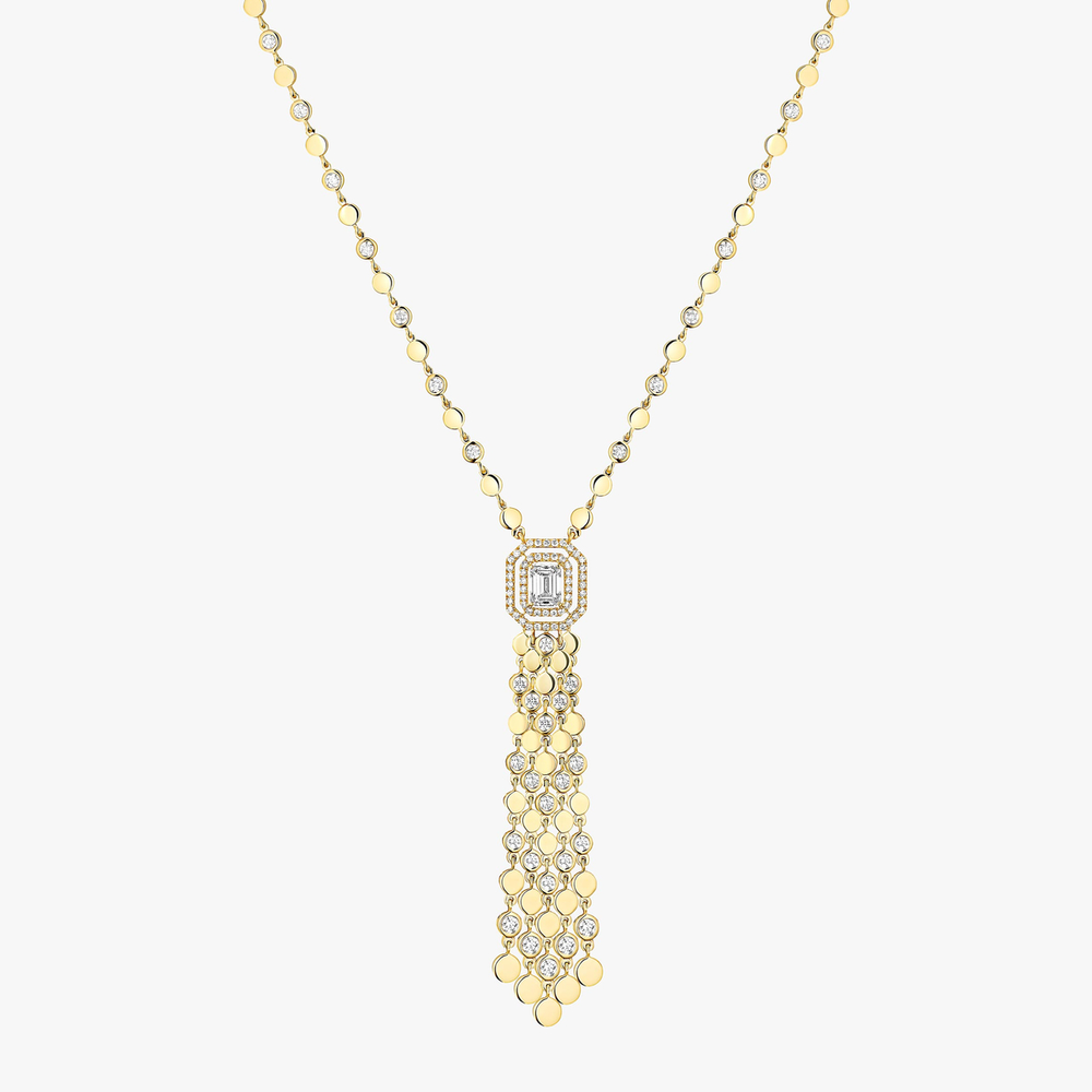 Graphisme du design et fluidité des lignes, le collier pompon D-Vibes en or jaune réinterprète avec éclat un classique de la joaillerie. A la fois moderne et subtilement rétro, ce collier diamant femme sublime votre silhouette en journée comme en soirée grâce à une multitude de portés. Sa rallonge amovible lui permet de combiner une diversité de styles, en jouant sur la longueur des portés, pour un look tantôt sophistiqué et tantôt casual-chic. Les précieux fils d’or et de diamants de son motif central dessinent un sublime pompon couronné par un diamant taille émeraude de 0,40ct. Les deux lignes de diamants entourant la pierre de centre accentuent son côté graphique dans un esprit Art Déco.