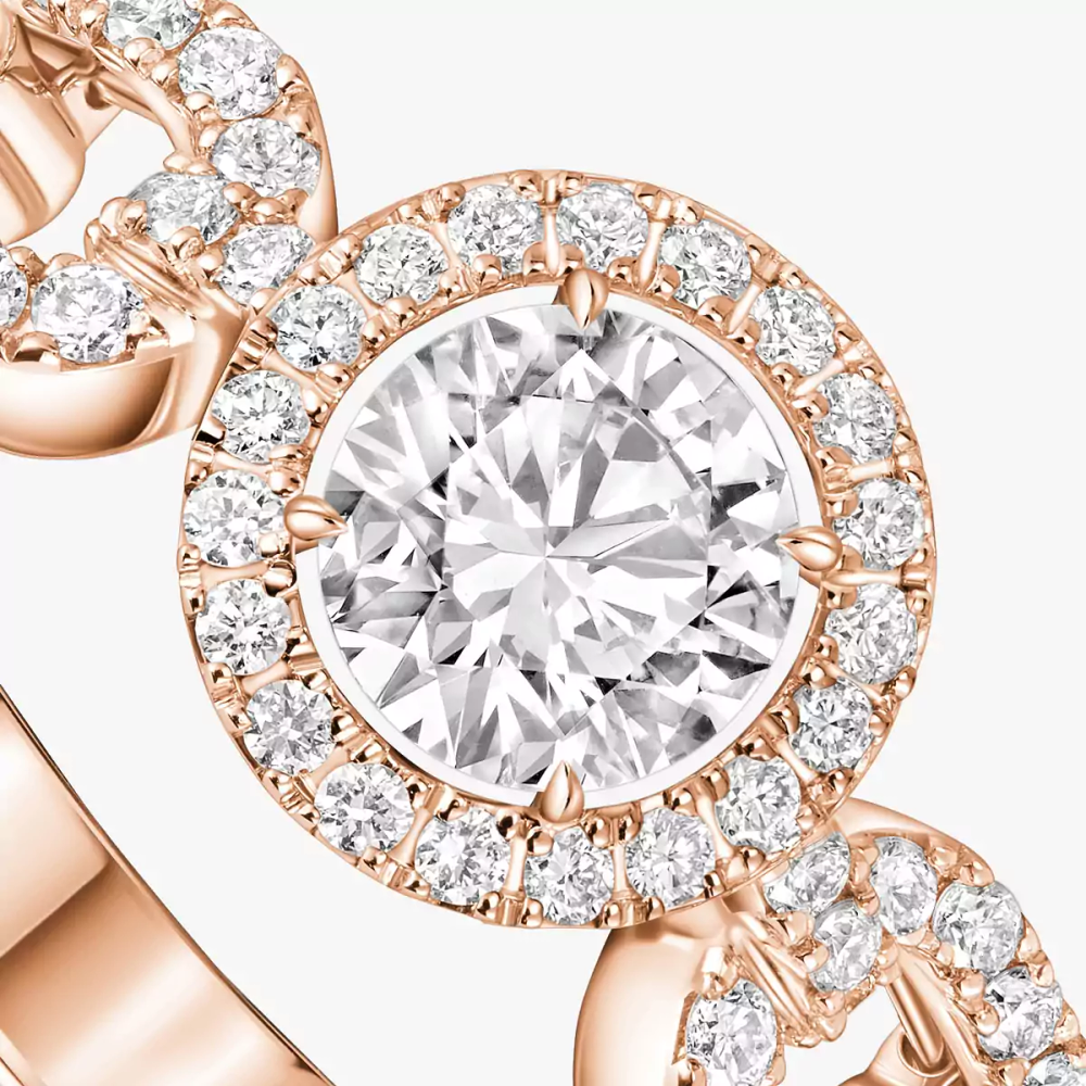 La bague de fiançailles signature de la Maison Messika. Les diamants en mouvement sur le corps de bague confèrent au bijou or rose un design original et résolument moderne, pour celles et ceux qui souhaitent symboliser leur engagement avec singularité. Une bague diamant or rose audacieuse rehaussée par un précieux diamant taille brillant de 0,30 carat, lui-même sublimé par un halo de diamants pour un éclat incomparable.