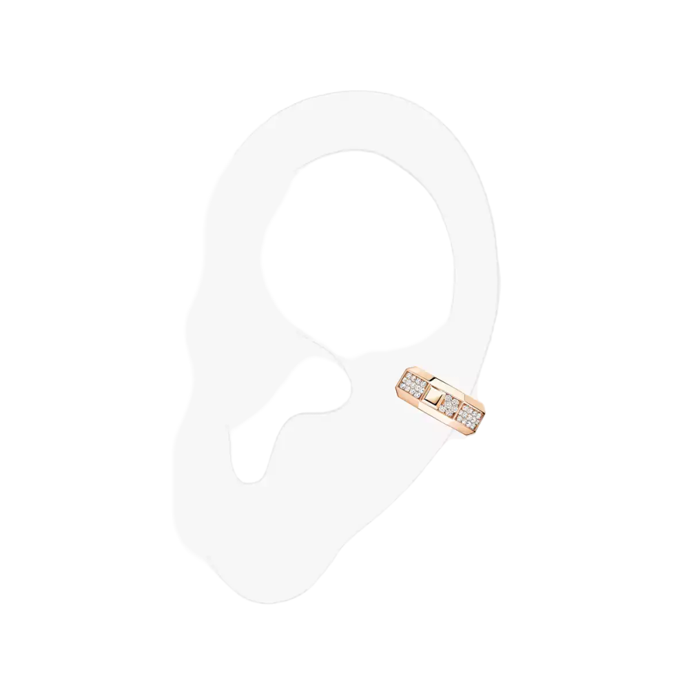 Inspirée par les lignes radicales de l’architecture contemporaine, la collection Moderniste explore la matière dans ses multiples dimensions, entre forme et lumière. Ce clip d'oreille diamant en or rose 18 carats impose sa présence par son volume affirmé et sa construction géométrique. L’or poli miroir dialogue subtilement avec la ligne de diamants centrale. Porté en asymétrie au milieu de l’oreille, il apporte un éclat distinctif. Bijou multi-facette, il souligne les contours de la personnalité de celle ou celui qui le porte. À porter seul ou en association avec une boucle d'oreille Moderniste pour façonner son style.