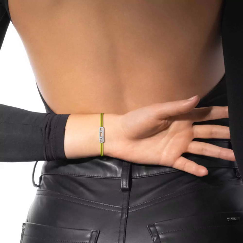 Original et engagé, le bracelet cordon jaune fluo et or blanc MESSIKA CARE(s) revisite le motif Move dans une version pavée, magnétique. Sa lumière vive et intense attire immédiatement le regard et ses trois diamants en mouvement signent l’allure avec style. Touche de lumière hautement symbolique, MESSIKA CARE(s) est une collection de joaillerie solidaire. Pour chaque bijou or et diamant vendu, la Maison reverse une partie des bénéfices via la Fondation Valérie Messika à des associations internationales et ONG œuvrant en faveur de l’enfance dans les domaines de l’éducation et de la santé.