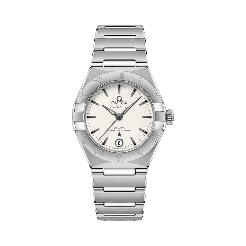 L’esthétique reconnaissable et intemporelle de la collection OMEGA Constellation se caractérise par ses fameuses demi-lunes, la présence des célèbres « griffes » sur la lunette et son bracelet mono-rang.Ce modèle en acier inoxydable de 29 mm arbore une lunette gravée de chiffres romains, un cadran blanc cristal argenté et un guichet de date à 6 heures. Les aiguilles, le logo OMEGA, l’étoile Constellation et les index, de couleur noire, offrent un superbe contraste avec le cadran blanc.Cette montre abrite un calibre OMEGA Co-Axial Master Chronometer 8700, visible à travers le fond du boîtier en verre saphir bombé résistant aux rayures.