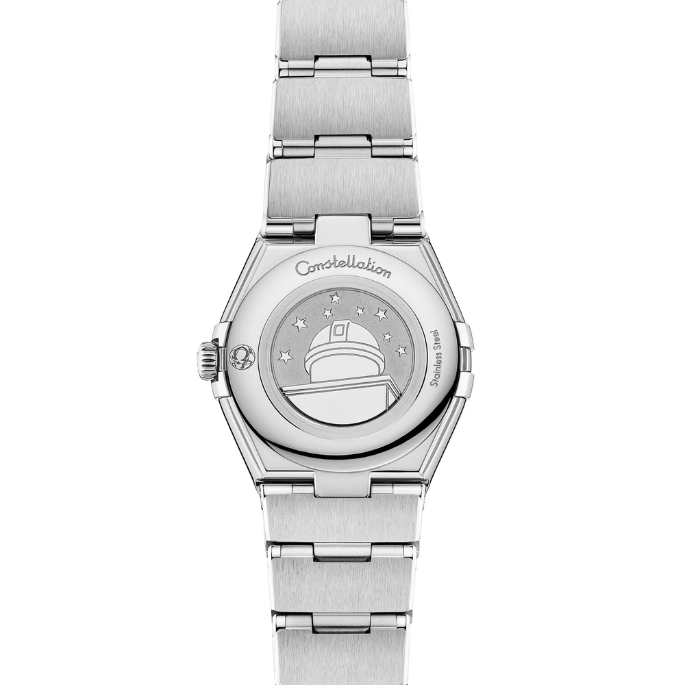 La montre est présentée sur un bracelet mono-rang signature doté d'un système de réglage confort et animée par le calibre OMEGA 4061, dissimulé derrière un médaillon estampé Observatoire Constellation sur le fond de boîte.