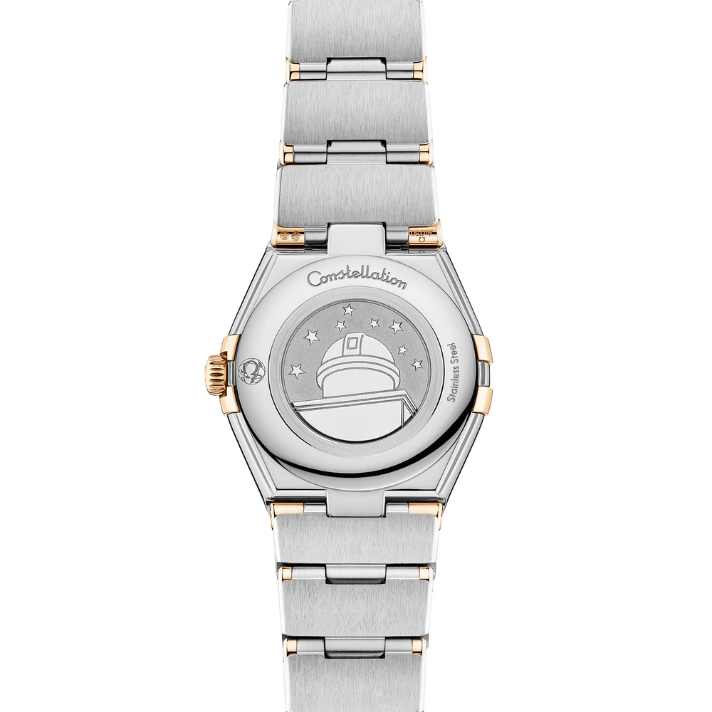 La montre est présentée sur un bracelet mono-rang signature doté d'un système de réglage confort et animée par le calibre OMEGA 4061, dissimulé derrière un médaillon estampé Observatoire Constellation sur le fond de boîte.