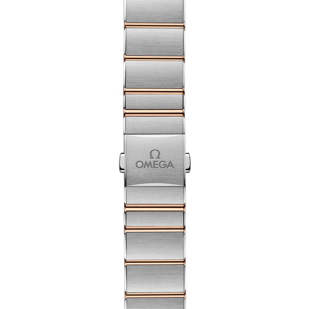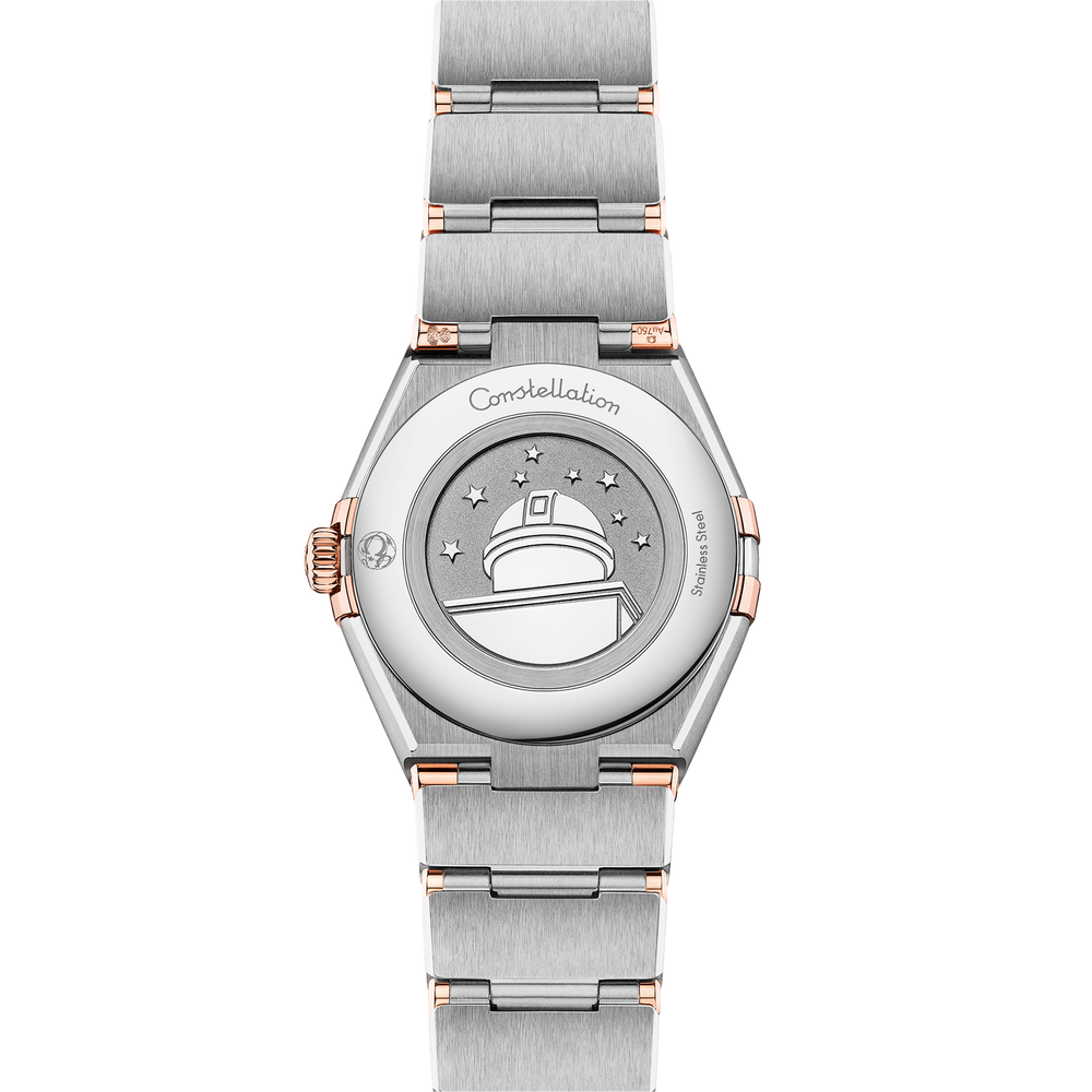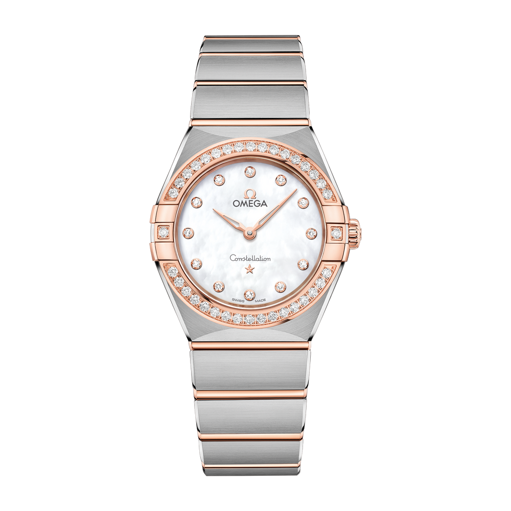 L’esthétique reconnaissable et intemporelle de la collection OMEGA Constellation se caractérise par ses fameuses demi-lunes, la présence des célèbres « griffes » sur la lunette et son bracelet mono-rang.Ce modèle en acier inoxydable et or Sedna™ 18K de 28 mm arbore une lunette pavée de diamants, un cadran en nacre blanche, des index sertis de diamants et un verre saphir résistant aux rayures. Les aiguilles, le logo OMEGA, l’étoile Constellation et les chatons des diamants sont également façonnés en or Sedna™ 18K.Cette montre abrite un calibre OMEGA 4061, dissimulé derrière le fond plein du boîtier estampillé du médaillon de l’Observatoire, signature de la Constellation.