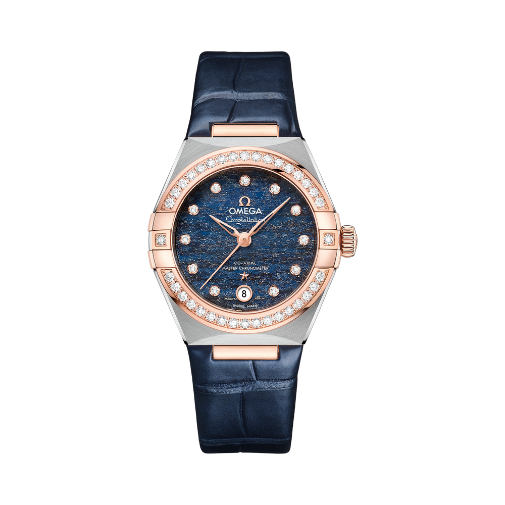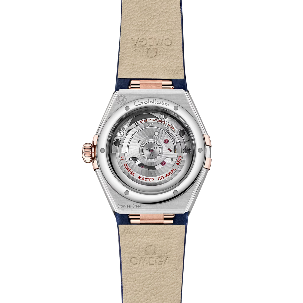 Confectionné en acier inoxydable et en or Sedna™ 18K, il possède une lunette pavée de diamants et un guichet de date à 6 heures. Les aiguilles, les index, le logo OMEGA et l’étoile Constellation sont réalisés en or Sedna™ 18K.