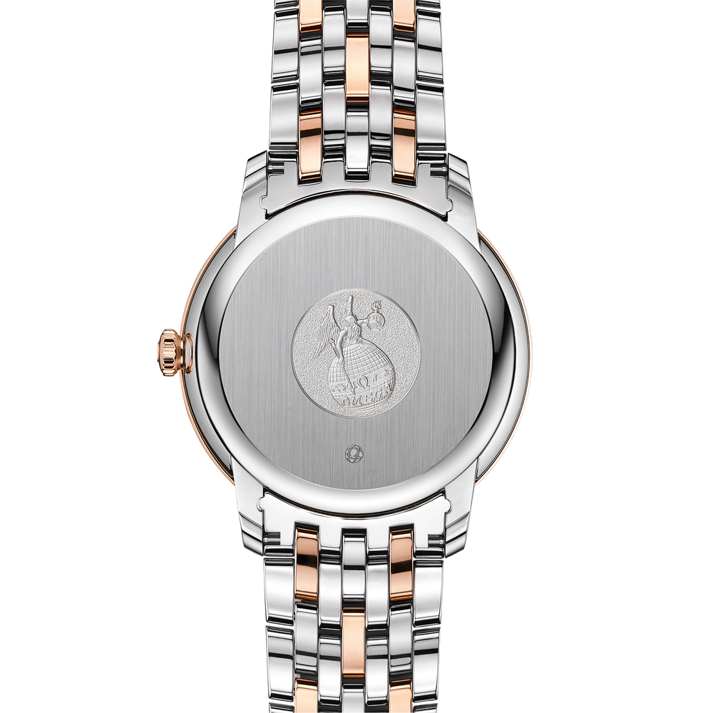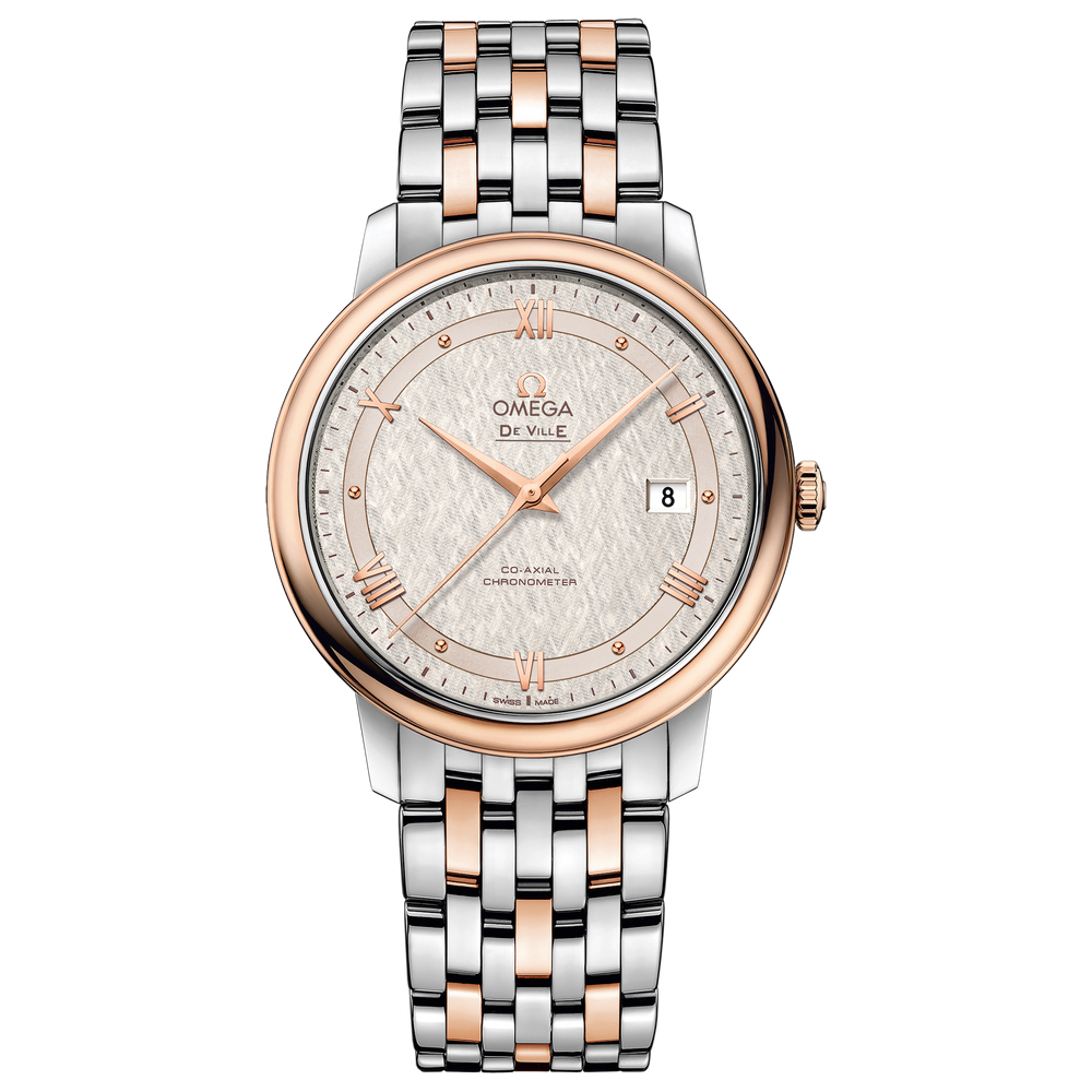 Grâce à son design classique et élégant, la collection OMEGA De Ville Prestige a su attirer une clientèle large et fidèle. Ces montres au design intemporel se distinguent par leur style épuré aux finitions luxueuses.Ce modèle est doté d’un cadran ivoire argenté avec finition opaline, décoré d’un motif rappelant la soie. Les aiguilles sont plaquées or, à l'instar des six cabochons et des six chiffres romains utilisés en guise d'index. On trouve également un guichet de date à 3 heures.Le boîtier de 39,5 mm en acier inoxydable et or rouge 18K repose sur un bracelet Prestige en acier inoxydable poli, agrémenté de touches dorées. Ce garde-temps est animé par le calibre Co-Axial 2500.