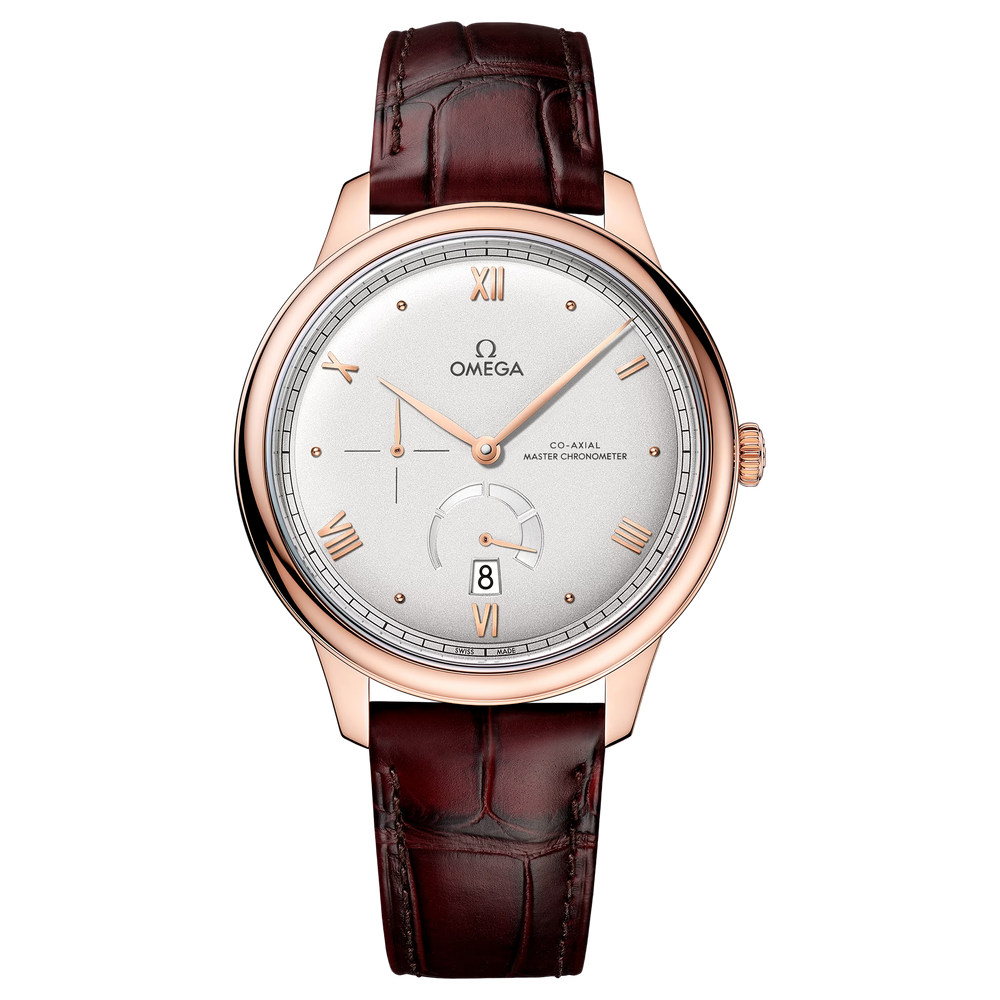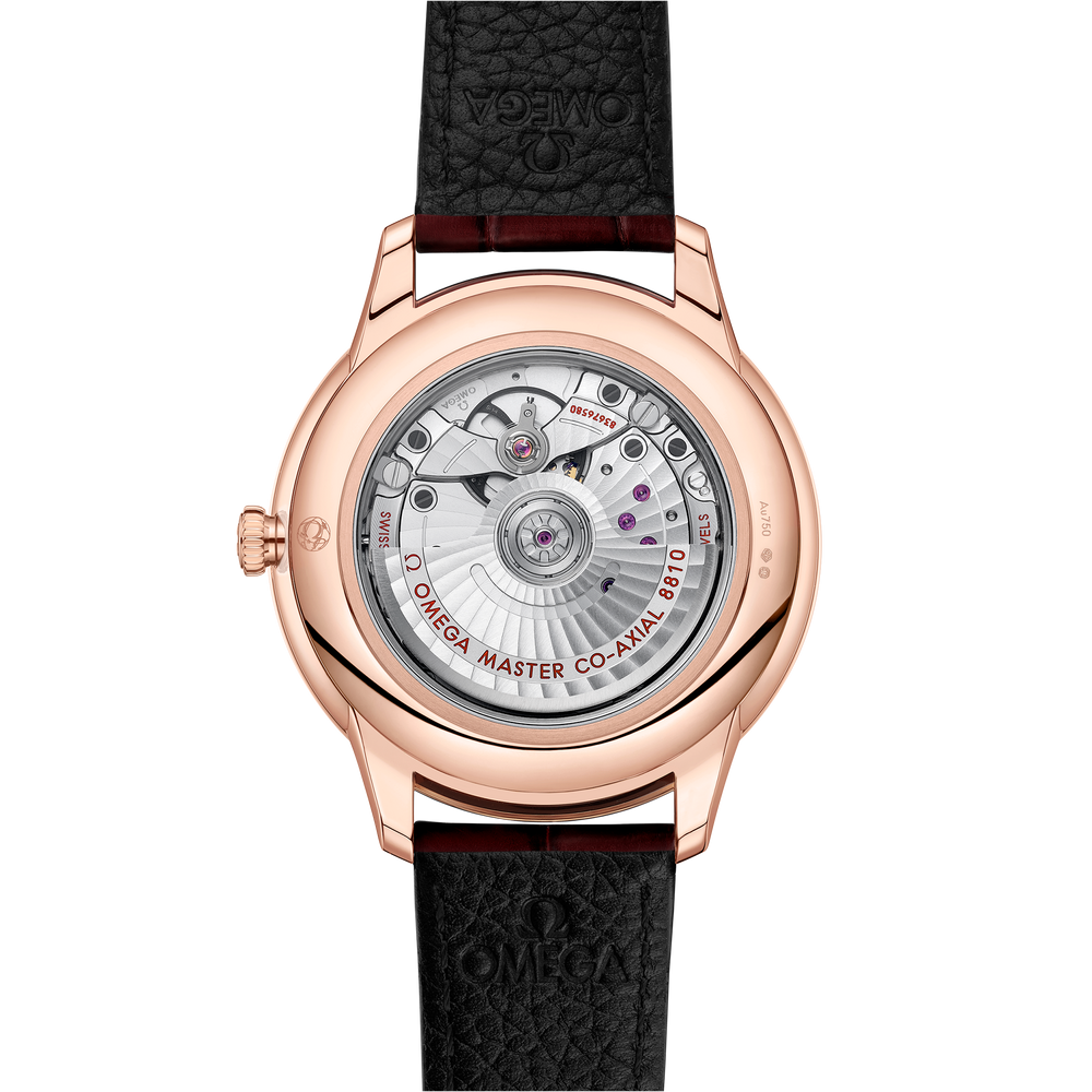Collection intemporelle depuis 1994, l’OMEGA De Ville Prestige connait aujourd'hui sa troisième génération. Continuant à représenter le design classique et l’élégance raffinée, ces montres se déclinent en une large gamme de motifs, de finitions et de couleurs pour s’adapter à différents styles de vie et personnalités.Sur ce modèle de 41 mm en or Sedna™ 18K, le cadran bombé argenté présente une finition cristal. L’affichage se distingue par des aiguilles PVD de couleur or Sedna™, ainsi que par l’alternance de chiffres romains et d’index cabochon. L'indicateur de réserve de marche de 270° est situé à 6 heures. Il arbore 4 découpes en forme de croissant et une sous-plaque appliquée dont la finition présente un subtil contraste de la même couleur.Le design épuré de la montre est complété par un guichet de date à 6 heures, un affichage de petite seconde à 9 heures et une minuterie en chemin de fer sur le pourtour.Cette montre certifiée Master Chronometer est montée sur un bracelet en cuir bordeaux et est animée par le calibre OMEGA Master Co-Axial 8810, que l’on peut admirer à travers le fond de boîte en verre saphir inrayable.