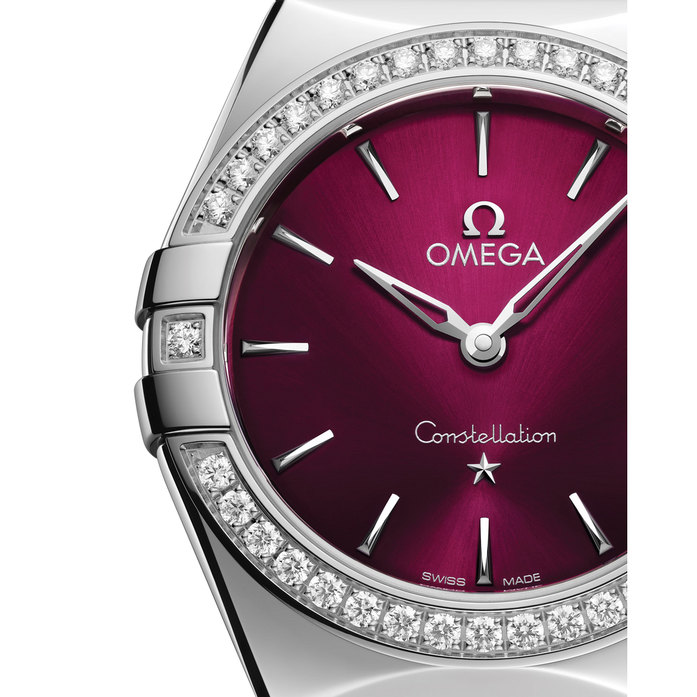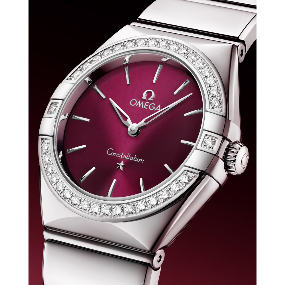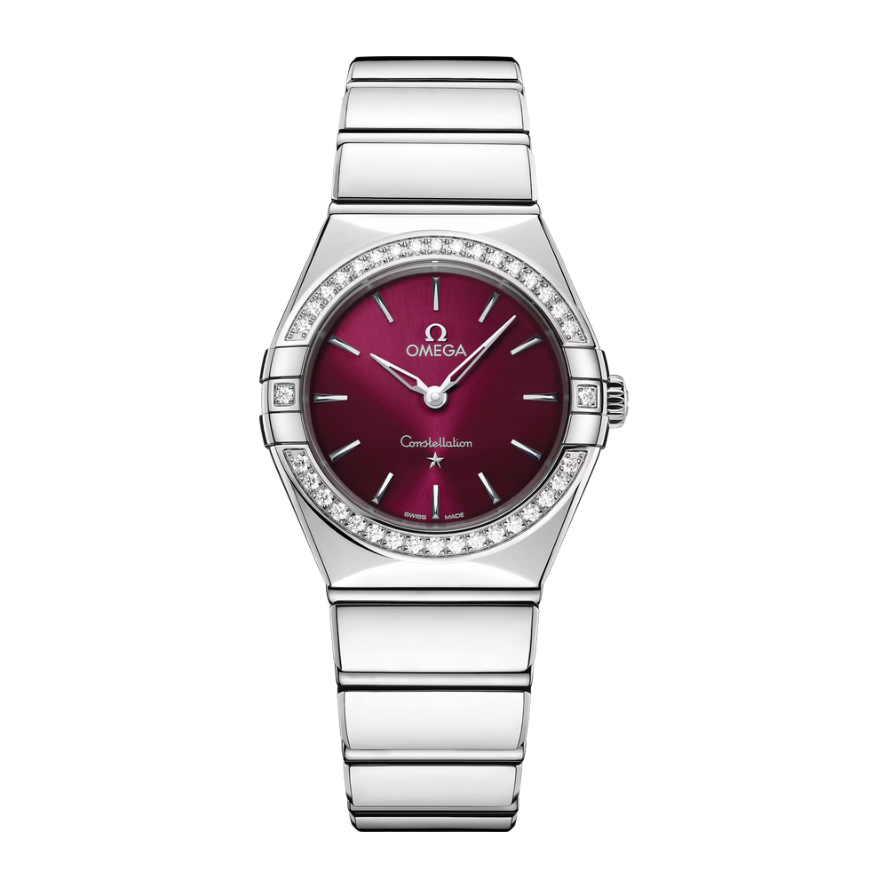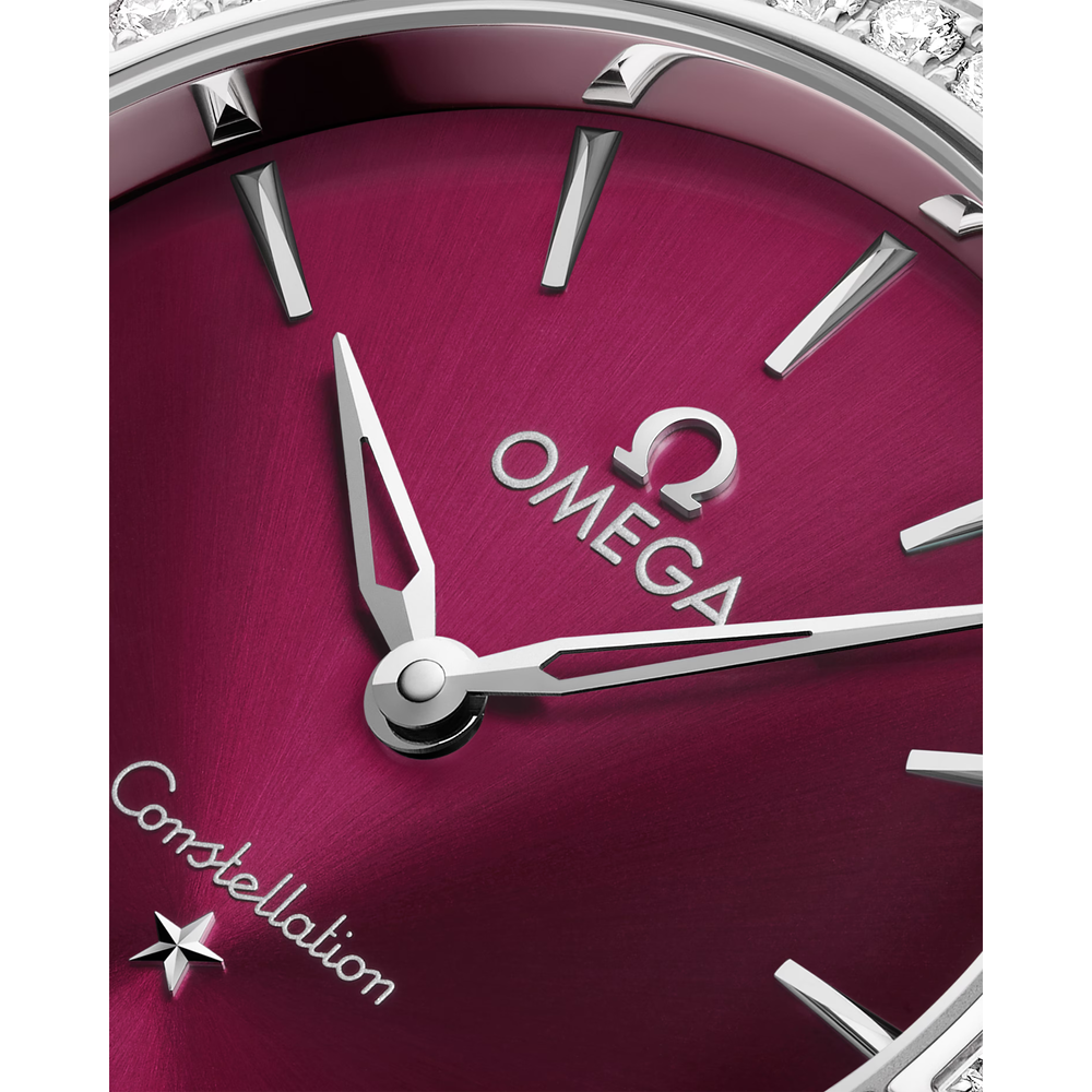 Ce modèle en acier inoxydable de 28 mm arbore une lunette éclatante pavée de diamants. Le cadran soleillé bordeaux est rehaussé d’une finition laquée teintée, ainsi que d’aiguilles et d’une étoile en or blanc 18K polies et squelettées à 6 heures et d’index en or blanc 18K poli.