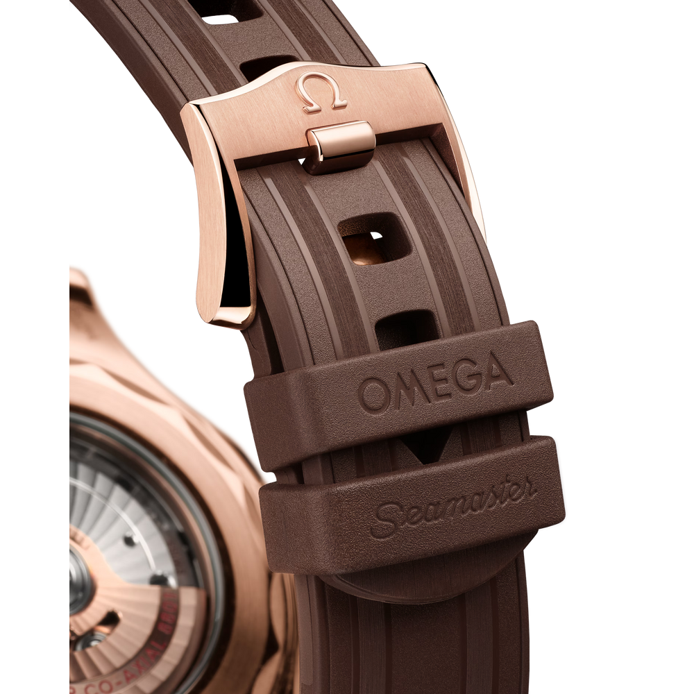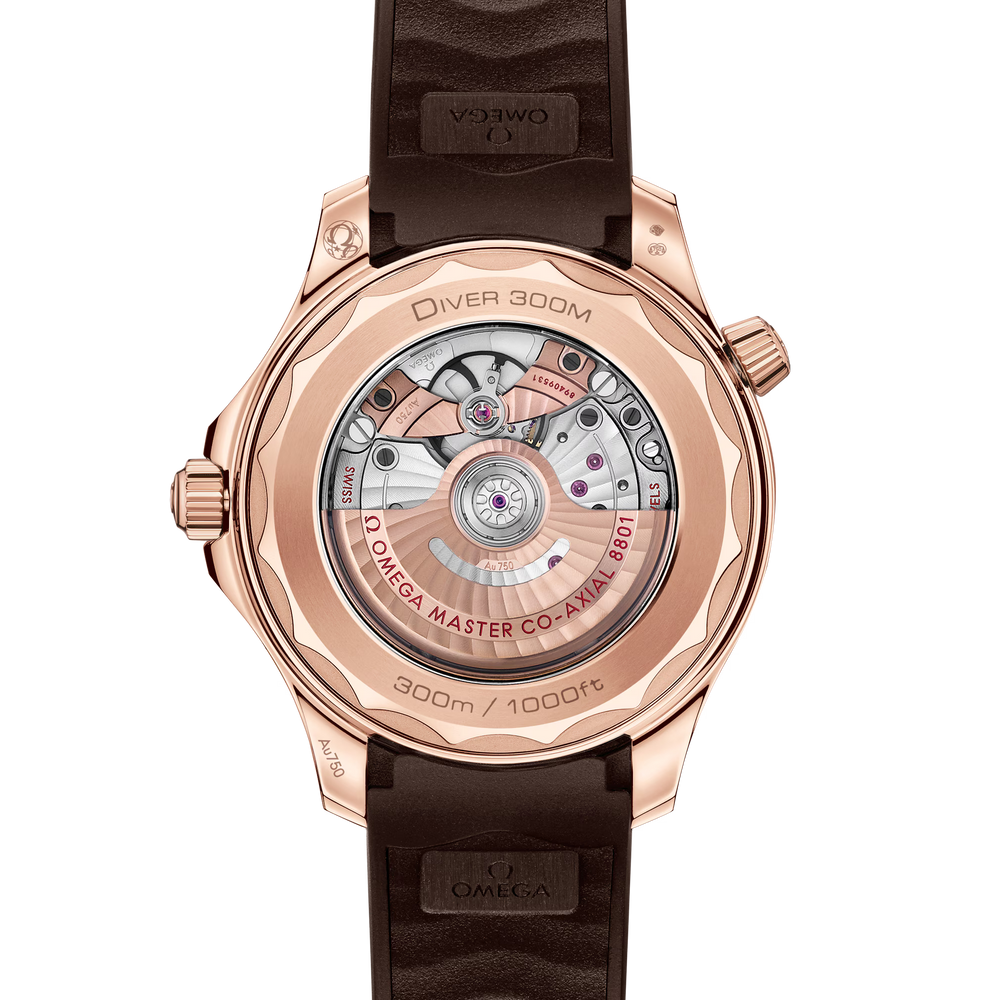 La montre est présentée sur un bracelet en caoutchouc brun et entraînée par le calibre OMEGA Master Chronometer 8801, que l’on peut admirer à travers le fond en verre saphir à bords ondulés.