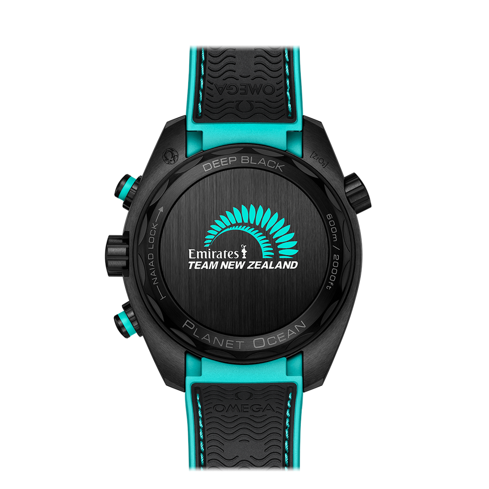 En hommage à l’équipage néo-zélandais, le fond de boîtier NAIAD LOCK arbore un logo Emirates Team New Zealand agrémenté d’une fougère turquoise et d’une inscription blanche. Entraînée par le calibre OMEGA Master Chronometer 9900, cette montre au caractère nautique repose sur un bracelet en caoutchouc noir et turquoise structuré, orné d’un fermoir en céramique noire et surpiqué de turquoise.