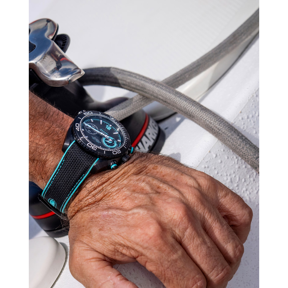 Le cadran en céramique mate fait référence à l’avant course avec un INDICATEUR DE COMPTE À REBOURS à 3 heures, complété par la mention START. L’aiguille et l’anneau de compteur de l’indicateur affichent la couleur turquoise du logo ETNZ, tout comme la minuterie, le chiffre 12 et l’aiguille centrale des secondes du chronographe ornée du trophée de la Coupe de l’America. La couleur se retrouve également sur les anneaux des poussoirs en céramique noire satinée, le HE sur la valve à l’hélium et le logo OMEGA qui orne la couronne.