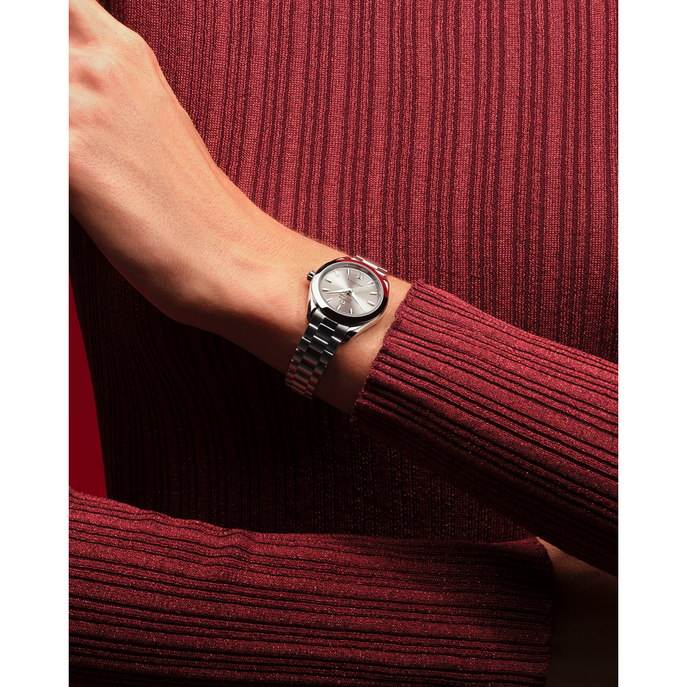 La montre est présentée sur un bracelet en acier inoxydable intégré aux superbes maillons arrondis polis et satinés. Fermé par une boucle déployante papillon, il présente le système de réglage confort d’OMEGA.