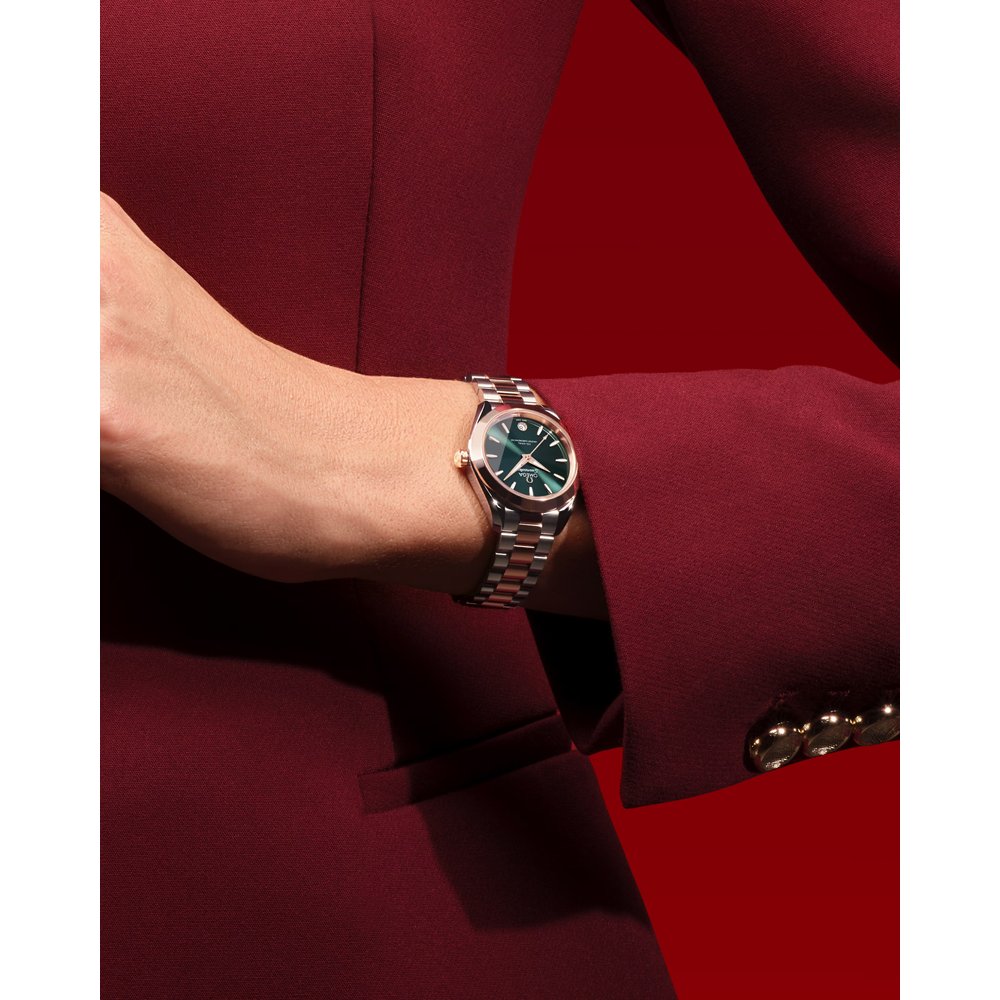 Son cadran laqué soleillé vert sapin arbore un guichet de date circulaire à 6 heures et 11 index en forme de coque de bateau. Les aiguilles facettées redessinées, dont celle des minutes à la pointe délicatement affinée, ainsi que l’ensemble des éléments appliqués sont façonnés en or Sedna™ 18K. Les index et les aiguilles sont également revêtus de Super-LumiNova blanc émettant une lueur bleue.