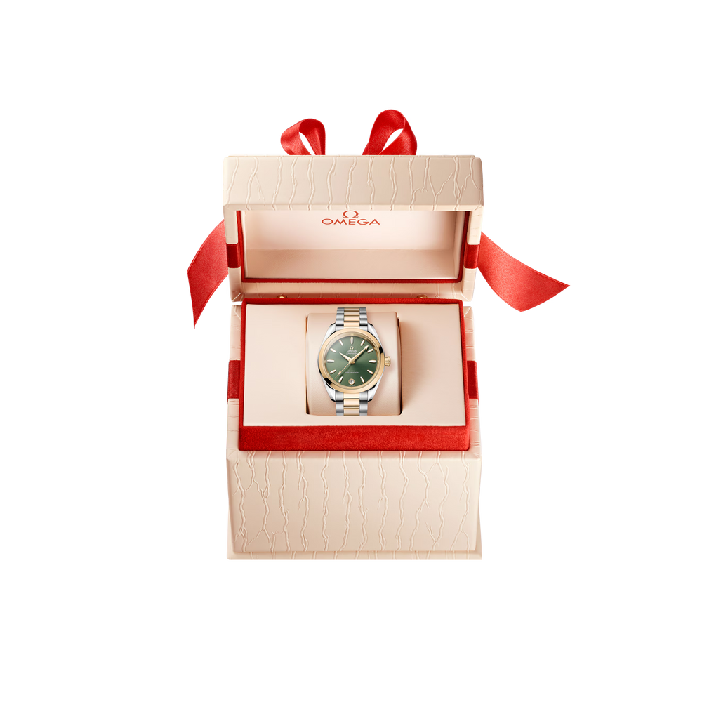 Elle arbore un cadran soleillé vert traité en PVD avec le logo OMEGA en or Moonshine™ 18K et un guichet de date à 6 heures. Les aiguilles et les index en forme de coque de bateau, également en or Moonshine™ 18K, sont revêtus de Super-LumiNova blanc émettant une lueur bleue.