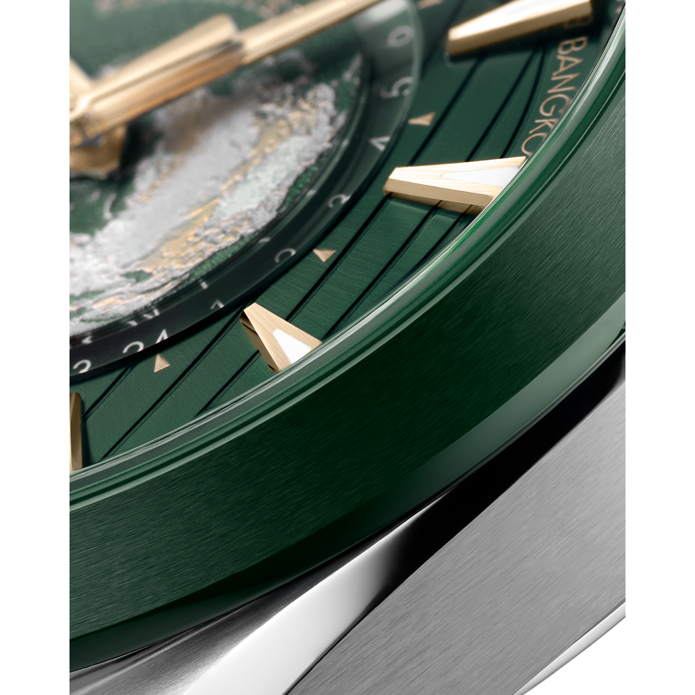 Au centre du cadran vert soleillé, encadré par une lunette en céramique verte satinée, OMEGA a réalisé une vision de la Terre, vue d’en haut du pôle Nord, par gravure au laser des continents et des couleurs sur une surface en titane de grade 5. Autour de la carte topographique se trouve une indication de 24 heures, divisée en des sections de nuit et de jour.