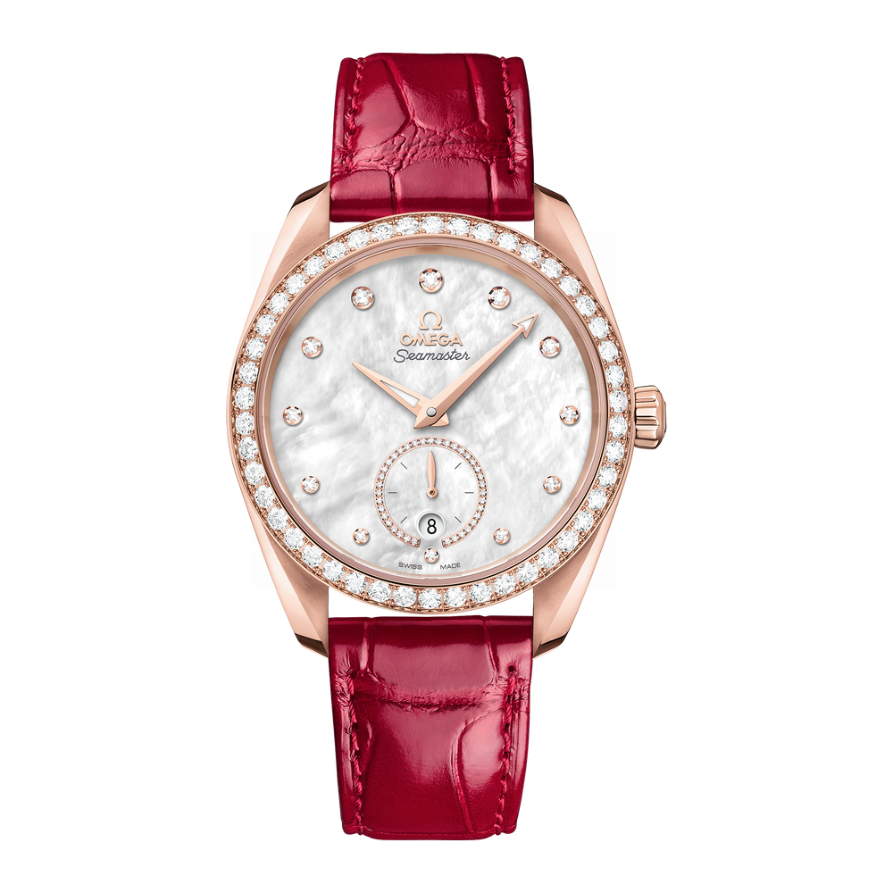 La Seamaster Aqua Terra constitue un magnifique hommage au vaste patrimoine maritime d’OMEGA. Le boîtier symétrique de 38 mm, façonné en or Sedna™ 18K, arbore une lunette parée de diamants et le verso est orné d’un motif vagues.Le cadran en nacre blanche arbore un guichet de date à 6 heures et un compteur de la petite seconde orné d’un anneau en or Sedna™ 18K serti de diamants. Le modèle est rehaussé d’aiguilles en or Sedna™ 18K revêtus de Super-LumiNova blanc, ainsi que d’index incrémentaux en diamants présentés sur des chatons en or Sedna™ 18K.Présentée sur un bracelet en cuir rouge, cette montre est entraînée par le calibre OMEGA Co-Axial Master Chronometer 8803 qui répond aux critères de performance les plus élevés de l’industrie horlogère, déterminés par l’Institut Fédéral Suisse de Métrologie (METAS).