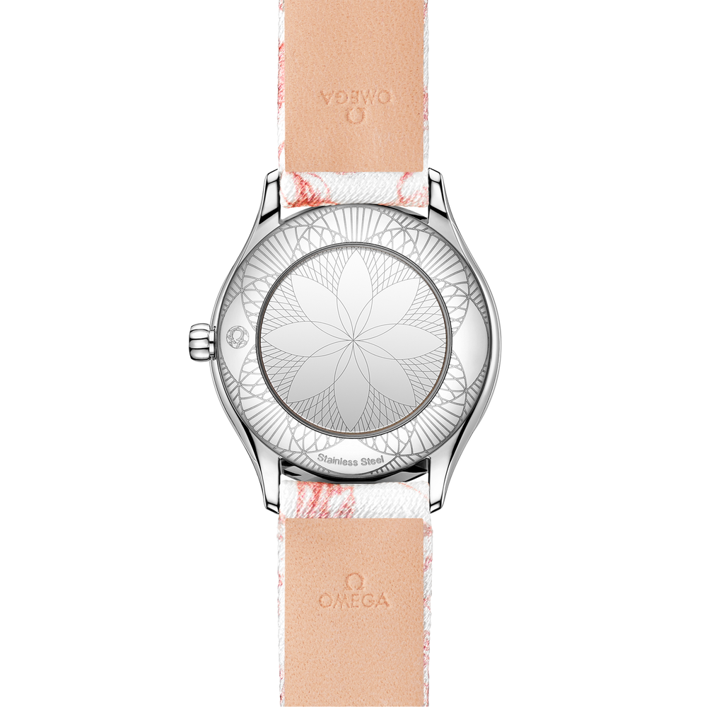 La montre est dotée d'un bracelet double tour en Toile de Jouy unique à motif floral rouge. La montre est entraînée par le calibre OMEGA 4061, dissimulé par un fond de boîtier miroir exclusif orné du motif « Her Time » métallisé.