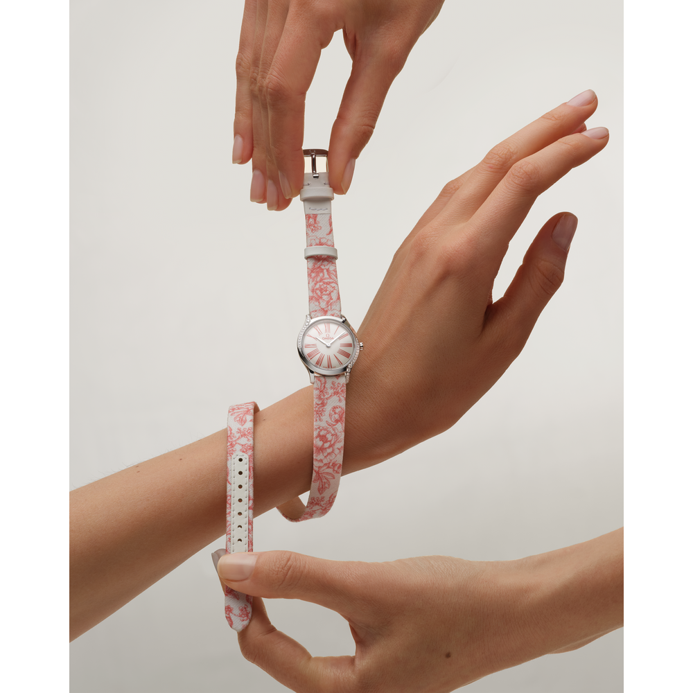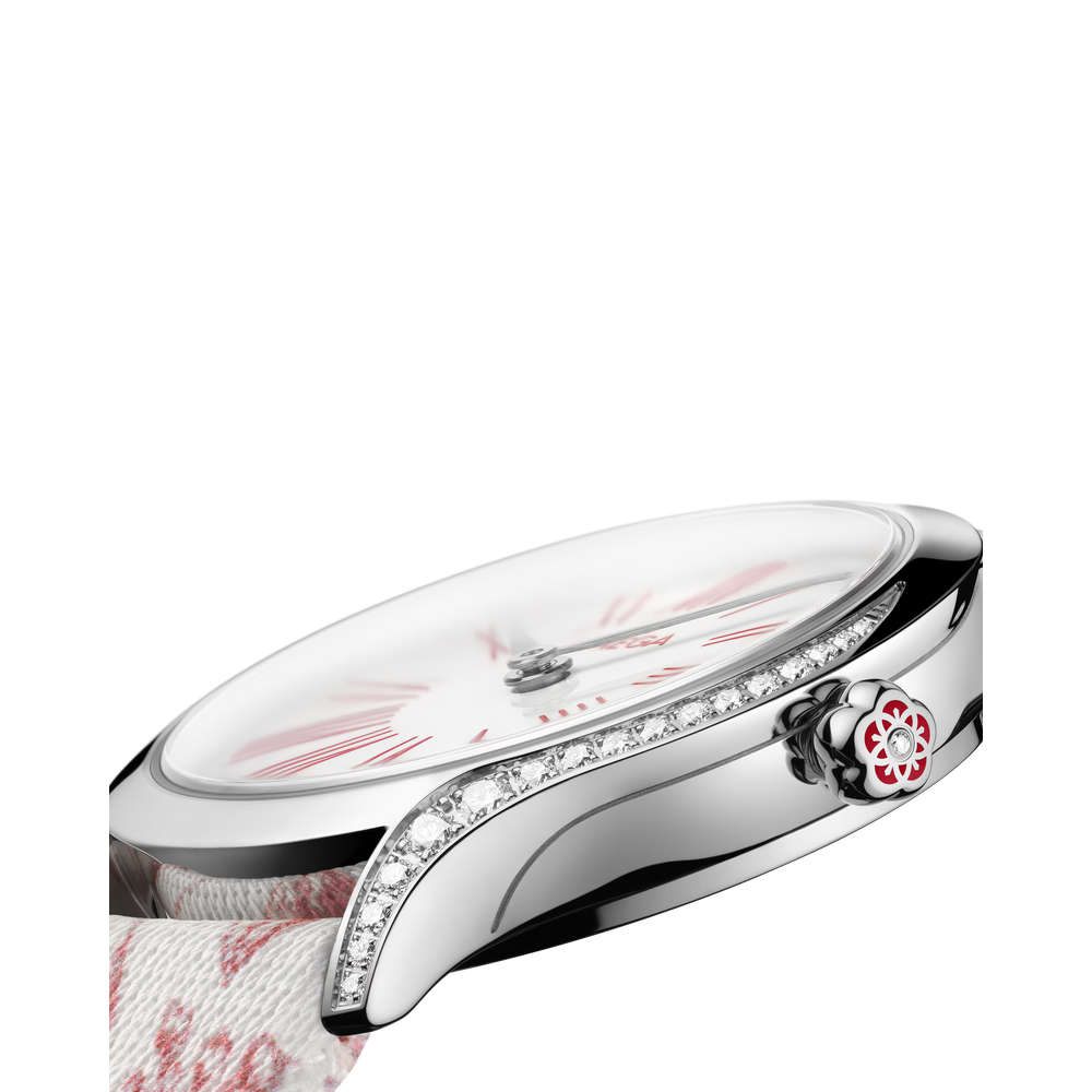 Elle arbore un boîtier de 26 mm en acier inoxydable, serti de diamants suivant délicatement les courbures de chaque côté. Un diamant unique orne la couronne, entouré d’une fleur en céramique liquide rouge. Le cadran bombé est réalisé en émail Grand Feu blanc crème et présente des aiguilles rhodiées polies au diamant et les chiffres romains roses en décalque.
