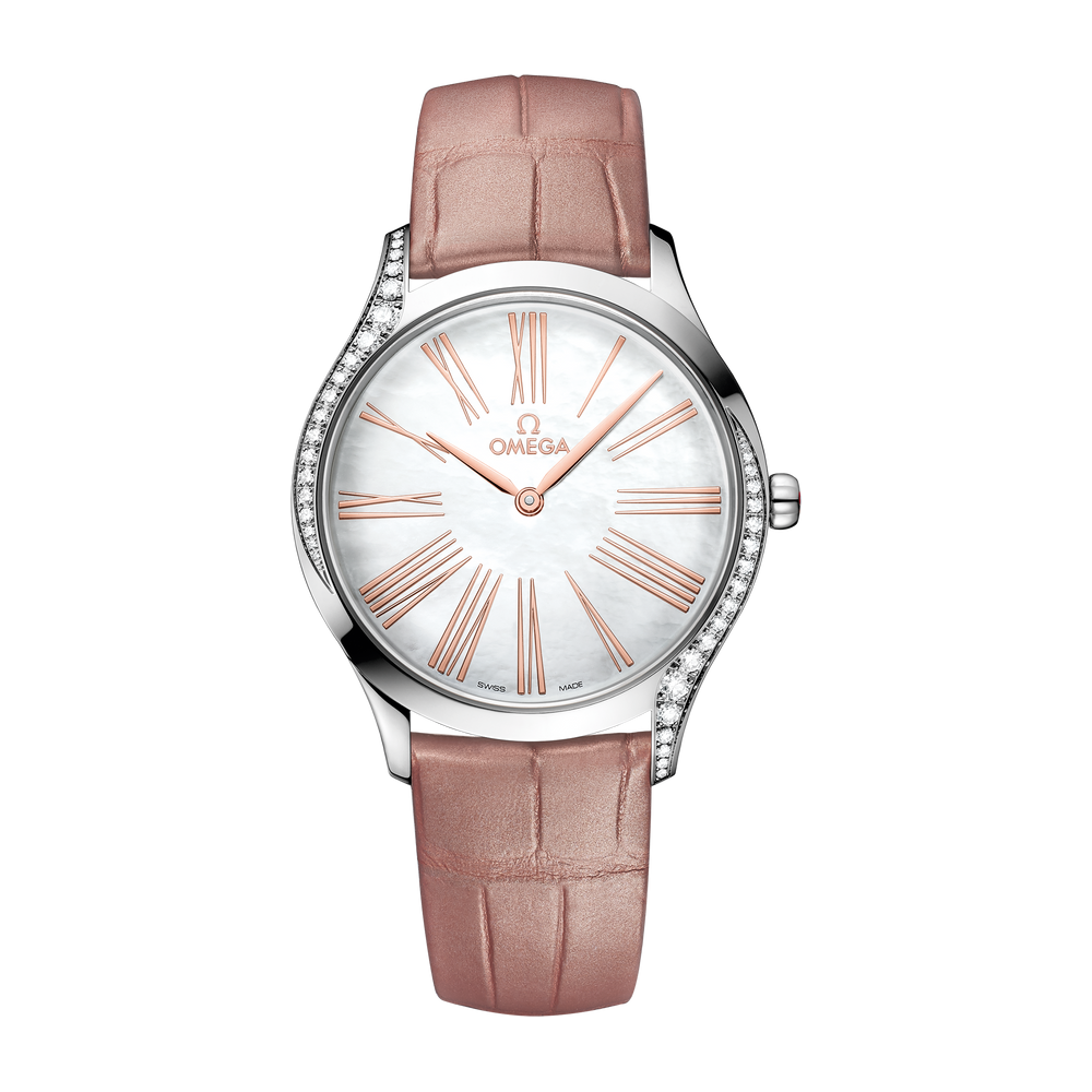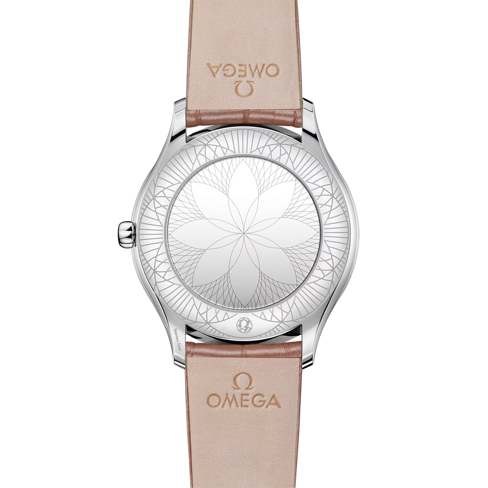 OMEGA conçoit depuis toujours de sublimes montres pour femme. Une tradition que l’on retrouve dans cette nouvelle collection de montres au design épuré et résolument moderne.Les courbes de ce boîtier plat de 36 mm en acier inoxydable sont rehaussées de deux volutes pavées de diamants. La couronne polie est, elle, ornée de céramique liquide rouge et sertie d’un unique diamant. Le cadran en nacre blanche laqué est pourvu de chiffres romains en applique et d’élégantes aiguilles en or Sedna™ 18K.La montre est entraînée par le calibre OMEGA 4061, dissimulé par un fond de boîtier miroir exclusif orné du motif « Her Time » métallisé. Elle repose sur un bracelet en cuir nude fermé par une boucle Trésor.