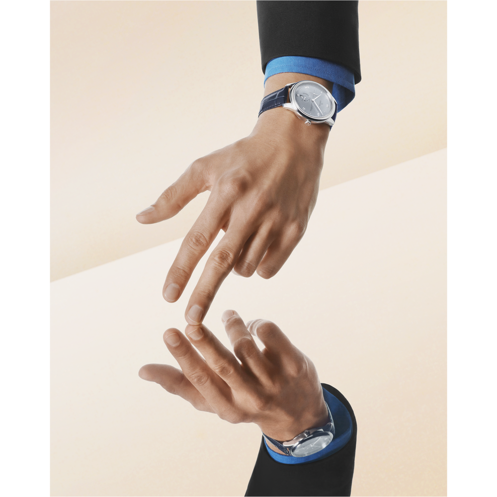Collection intemporelle depuis 1994, l’OMEGA De Ville Prestige connait aujourd'hui sa troisième génération. Continuant à représenter le design classique et l’élégance raffinée, ces montres se déclinent en une large gamme de motifs, de finitions et de couleurs pour s’adapter à différents styles de vie et personnalités.Sur ce modèle de 41 mm en acier inoxydable, le cadran bombé PVD bleu clair arbore un motif vertical aléatoire estampé dans une finition soleillée. L’affichage se distingue par des aiguilles rhodiées, ainsi que par l’alternance de chiffres romains et d’index cabochon. L'indicateur de réserve de marche de 270° est situé à 6 heures. Il arbore 4 découpes en forme de croissant et une sous-plaque appliquée dont la finition présente un subtil contraste de la même couleur.Le design épuré de la montre est complété par un guichet de date à 6 heures, un affichage de petite seconde à 9 heures et une minuterie en chemin de fer sur le pourtour.Cette montre certifiée Master Chronometer est montée sur un bracelet en cuir bleu foncé et est animée par le calibre OMEGA Master Co-Axial 8810, que l’on peut admirer à travers le fond de boîte en verre saphir inrayable.