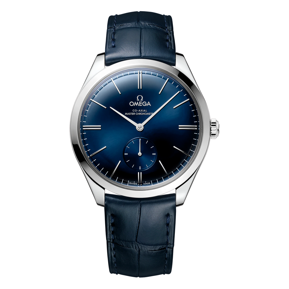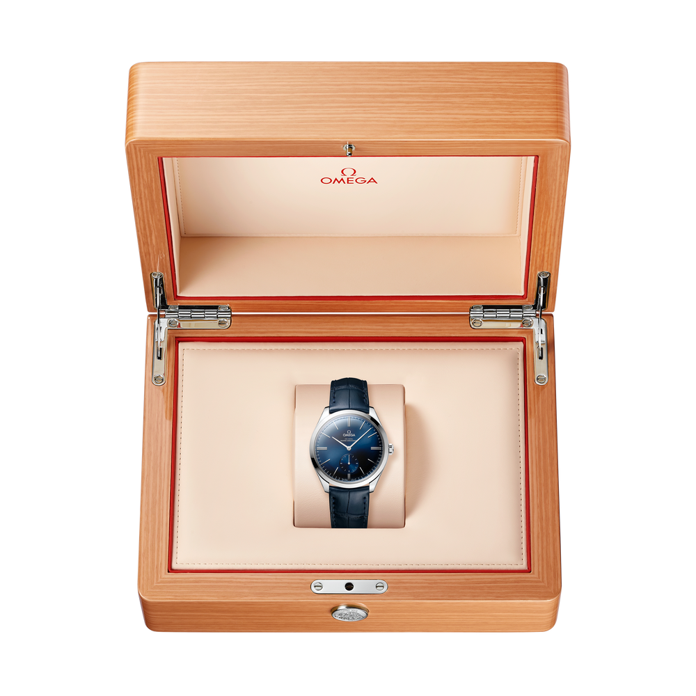 Ce modèle présente un boîtier poli en acier inoxydable de 40 mm monté sur un bracelet en cuir bleu. Le cadran bombé bleu comprend un guichet pour la petite seconde à 6 heures ainsi que des aiguilles et des index bombés en or blanc 18K.