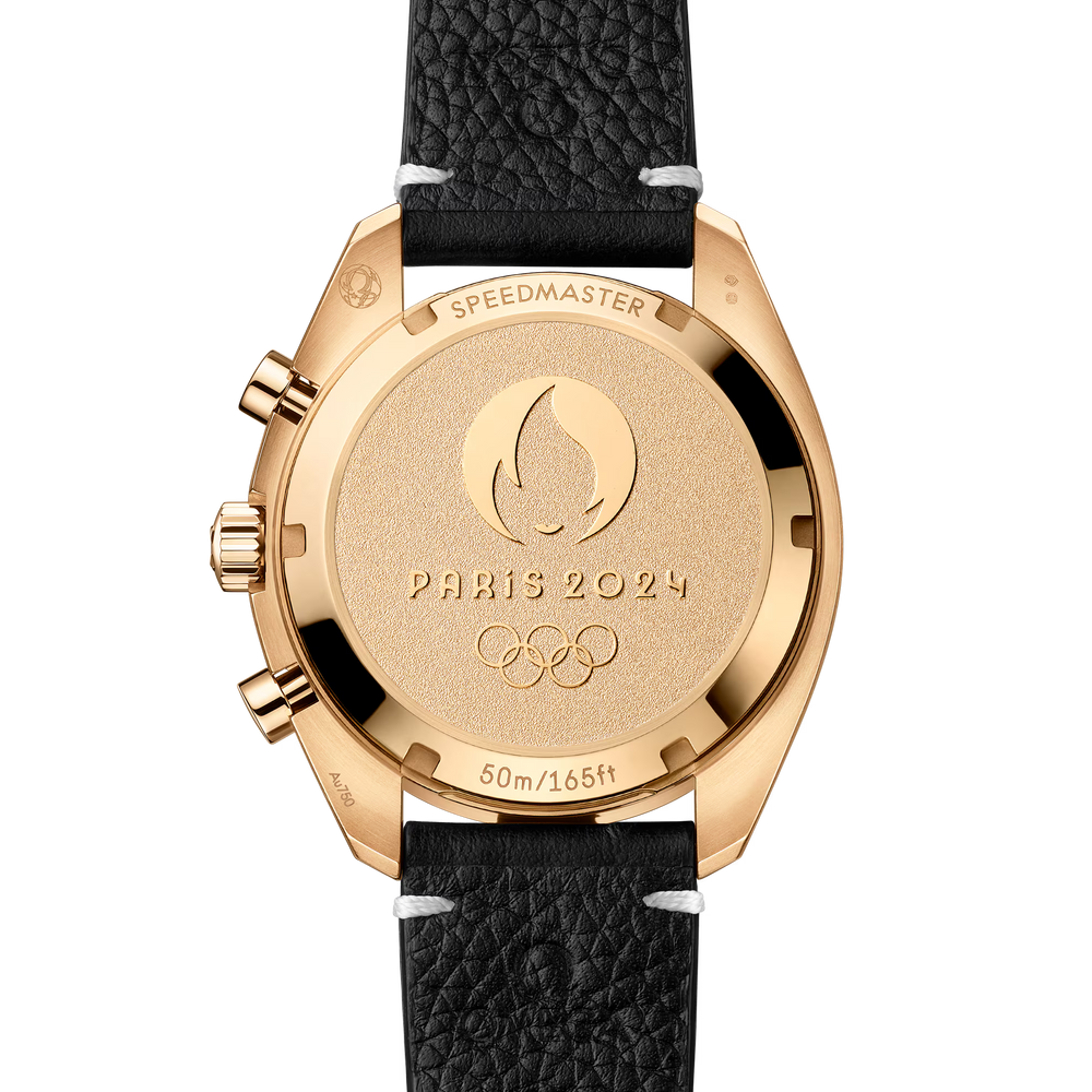 Au dos, le fond de boîtier commémoratif en or Moonshine™ 18K révèle un médaillon avec une base givrée, estampillée du logo Paris 2024 poli effet miroir avec l’inscription « Paris 2024 » et les anneaux olympiques.