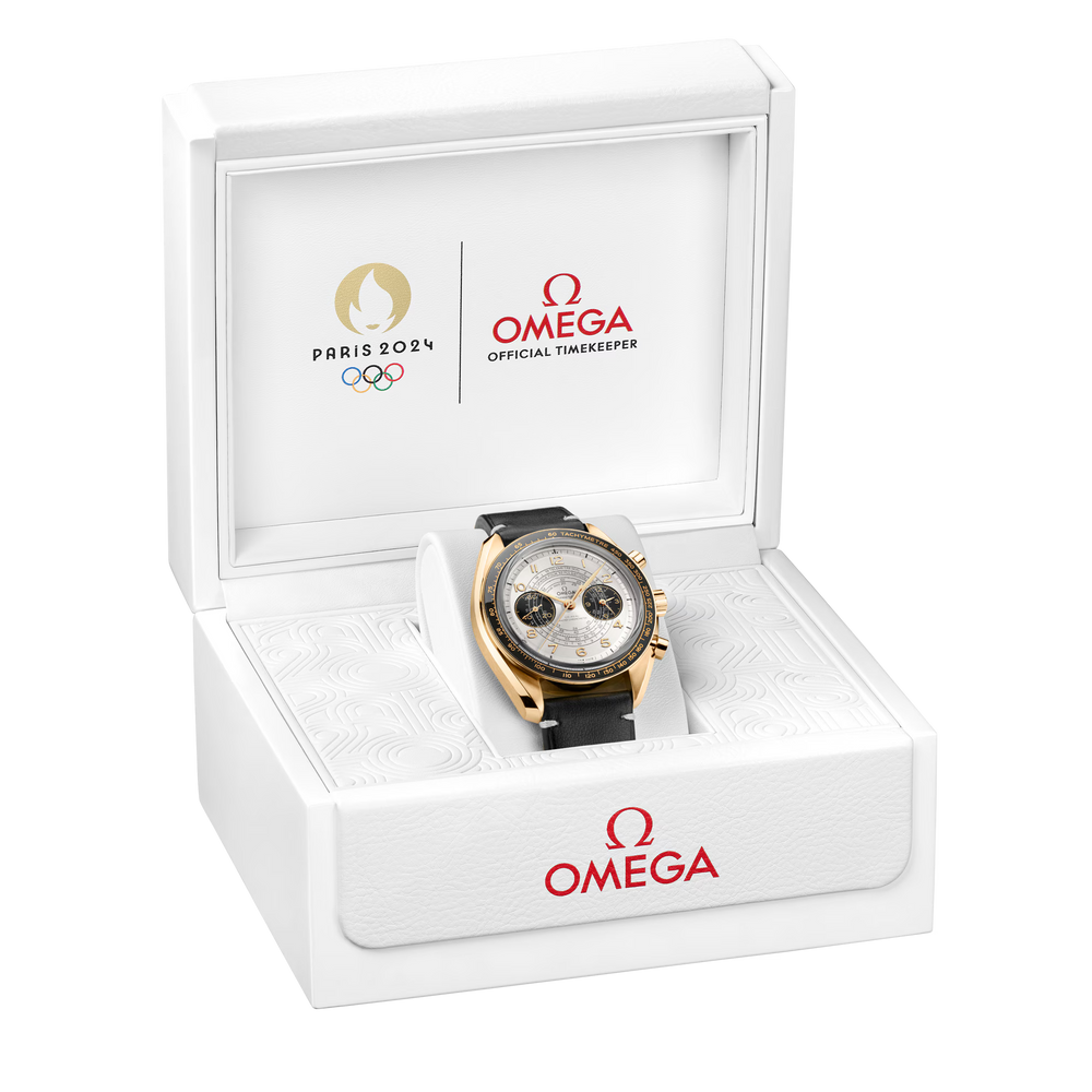 Ce modèle de 43 mm rend hommage aux Jeux Olympiques de Paris 2024 et arbore les trois couleurs principales de l’événement, à savoir l’or, le noir et le blanc. Cette montre est confectionnée en or Moonshine™ 18K avec un cadran opalin blanc argenté et des compteurs noircis. Elle se caractérise également par une lunette en céramique noire avec échelle tachymétrique en Ceragold™ OMEGA, des chiffres arabes en or Moonshine™ 18K, des aiguilles feuilles et des aiguilles des compteurs avec revêtement PVD or Moonshine™.