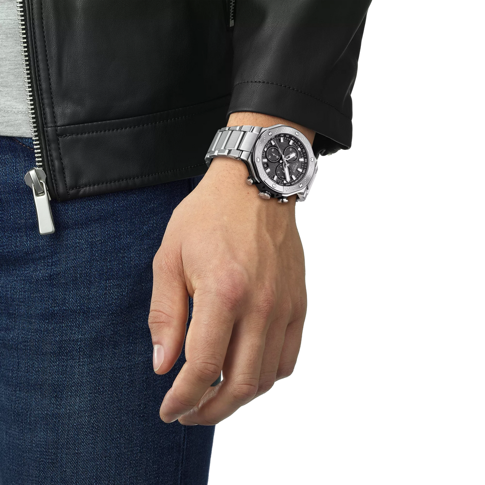 Tissot s'est inspiré de son partenariat avec la course moto pour créer une montre qui reflète le dynamisme des motos et l'émotion du sport.. La collection T-Race immerge le porteur dans un environnement mécanique et en réveille l'esprit. La lunette ressemble à un disque de frein, les poussoirs s'inspirent des guidons et les ailettes de refroidissement d'un moteur sont reproduites sur le côté du boîtier. La montre est étanche jusqu'à une pression de 10 bar (100 m), équipée d'un mouvement chronographe à quartz et dispose d'aiguilles des heures et des minutes marquantes recouvertes de SuperlumiNova.