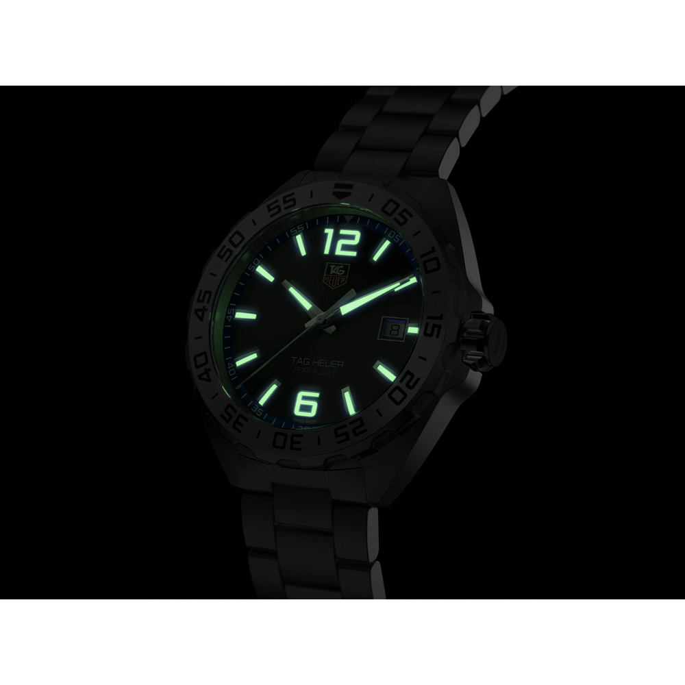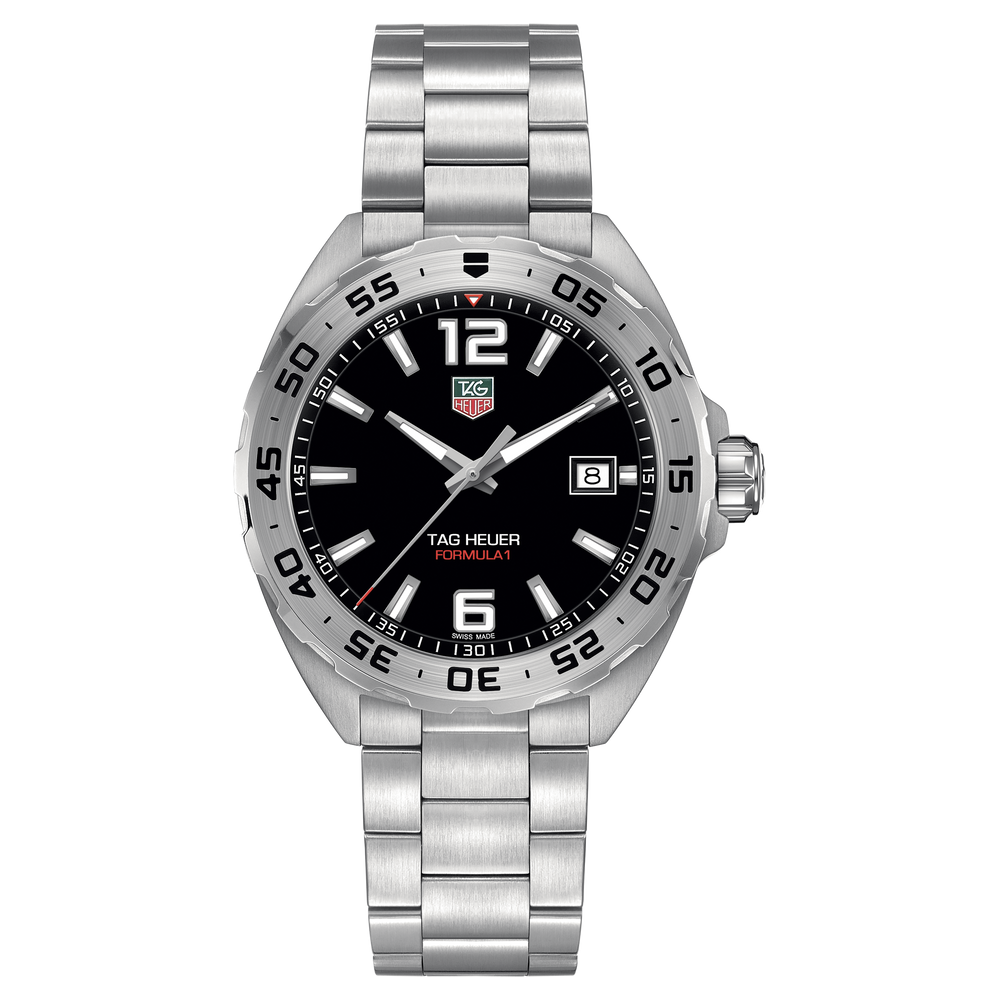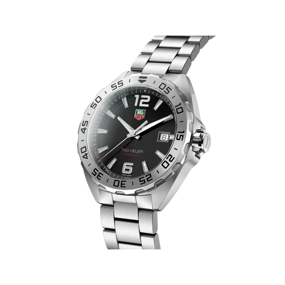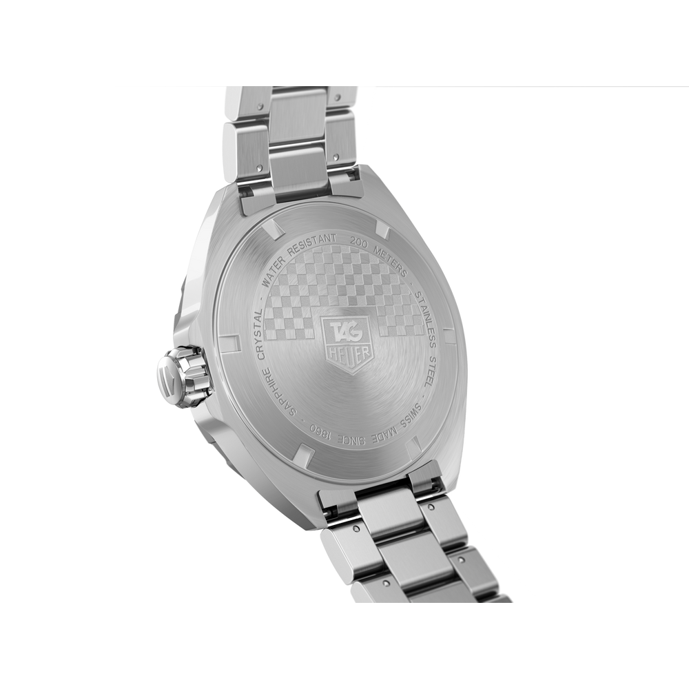 Une montre de sport noire avec un boîtier de 41 mm et un bracelet 3 rangs, tous deux en acier, ainsi qu'une lunette tournante unidirectionnelle dotée d'une échelle des minutes. L'aguille des secondes se termine par une pointe rouge, tandis que le blason tricolore de TAG Heuer renforce le design audacieux de son cadran.