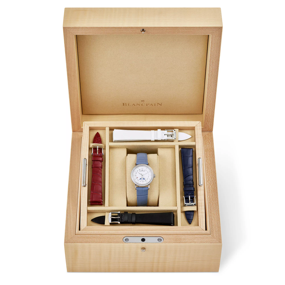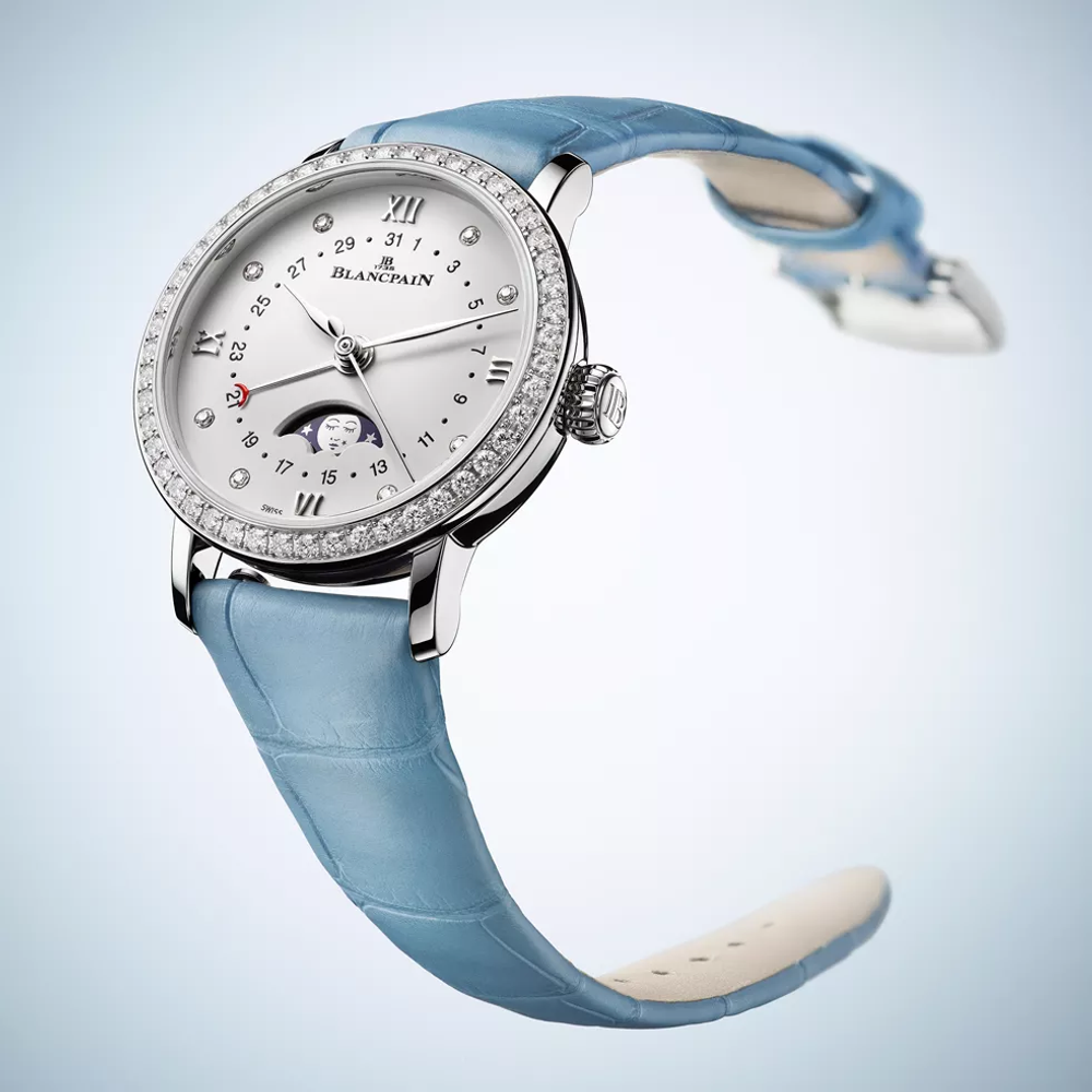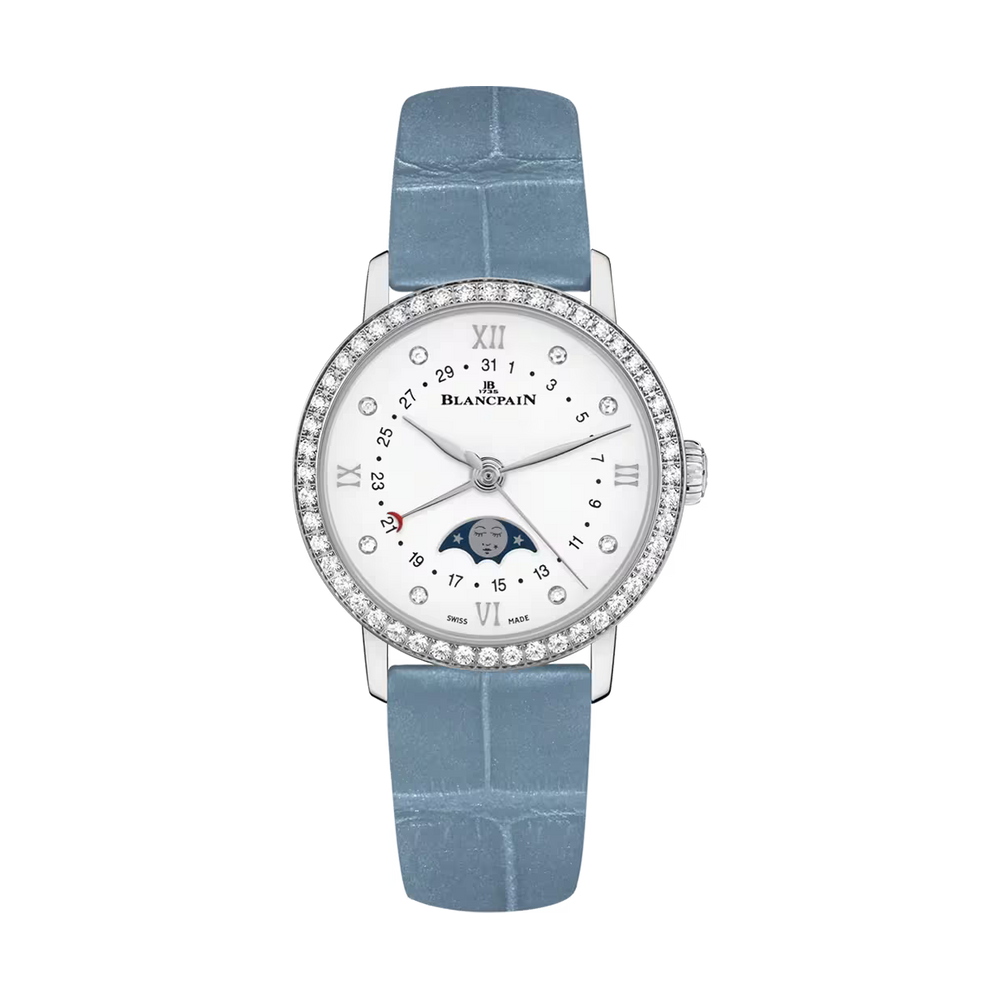Une complication de phase de lune suit le cycle lunaire de 29,5 jours avec un disque rotatif sous le cadran, entraîné par une roue de 59 dents. Il allie fonction et poésie. Blancpain est réputé pour affiner cette caractéristique, alliant précision, tradition et élégance dans chaque affichage au clair de lune.