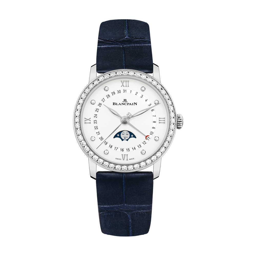 Une complication de phase de lune suit le cycle lunaire de 29,5 jours avec un disque rotatif sous le cadran, entraîné par une roue de 59 dents. Il allie fonction et poésie. Blancpain est réputé pour affiner cette caractéristique, alliant précision, tradition et élégance dans chaque affichage au clair de lune.