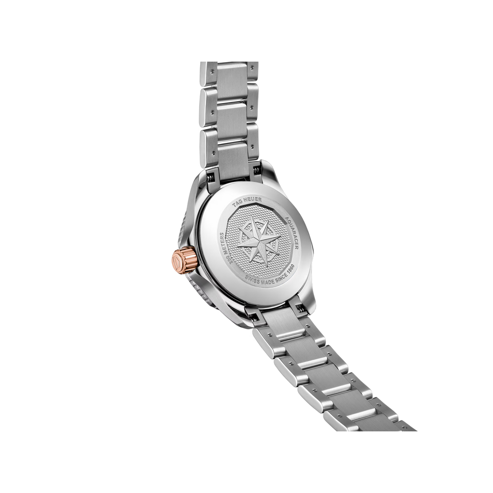 L’élégance définit cette montre TAG Heuer Aquaracer, qui met en valeur la beauté raffinée des touches d’or rose massif 5N 18 carats et l’éclat des diamants chatoyants. Avec son captivant cadran en nacre noir fumé et son élégant bracelet en acier inoxydable, cette montre est prête à explorer de nouveaux horizons.
