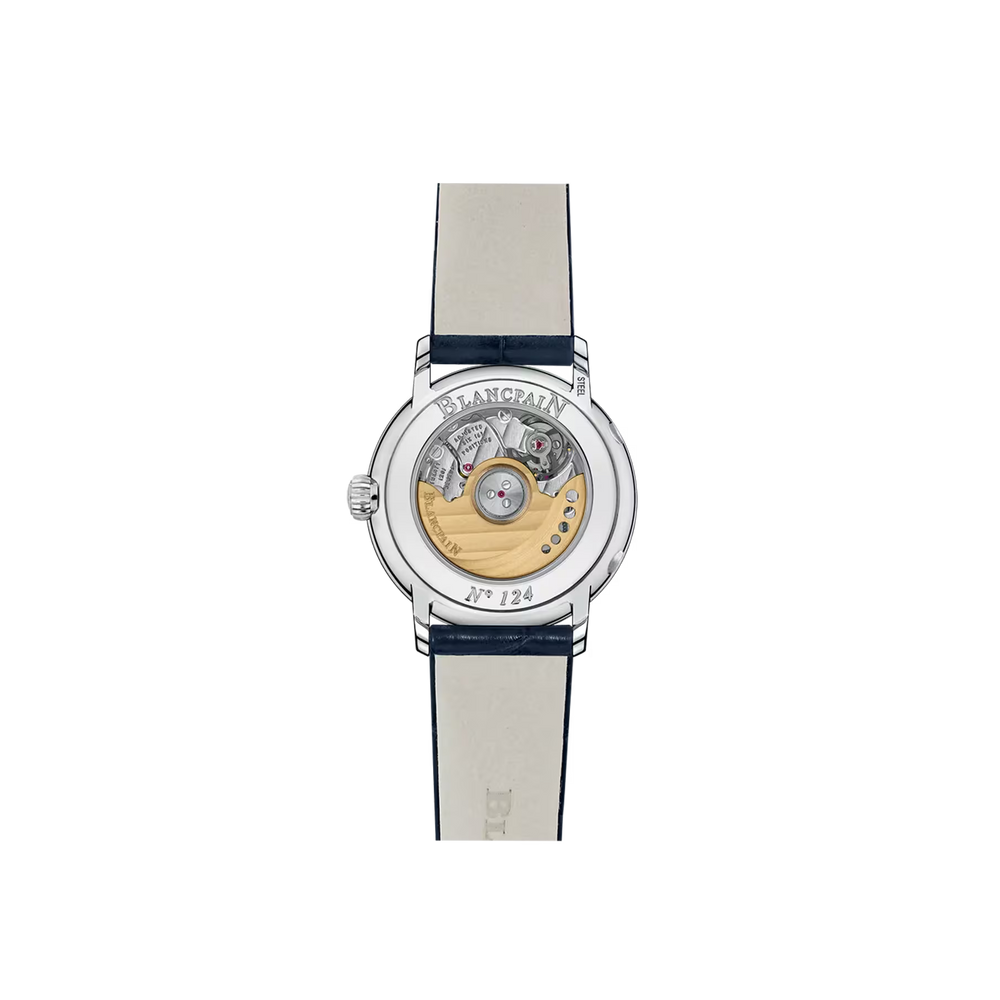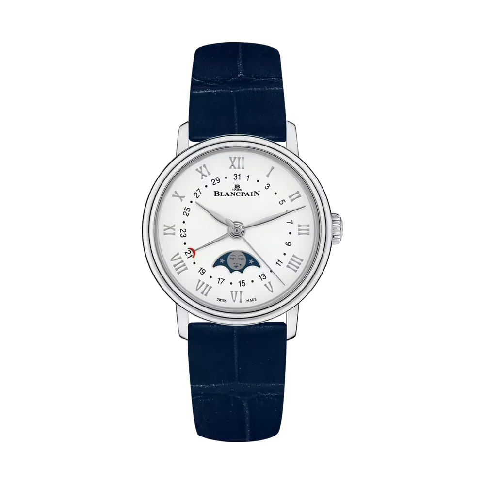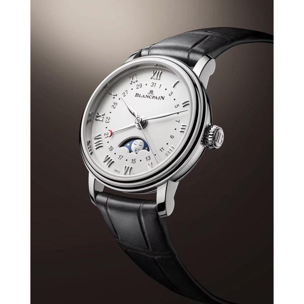 A moon phase complication tracks the 29.5-day lunar cycle with a rotating disc beneath the dial, driven by a 59-tooth wheel. It blends function with poetry. Blancpain is renowned for refining this feature, combining precision, tradition, and elegance in every moonlit display.