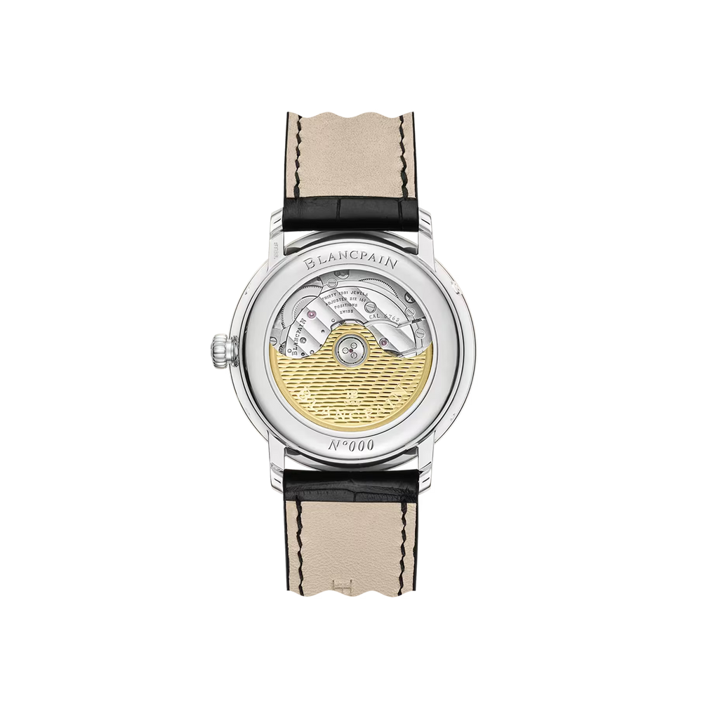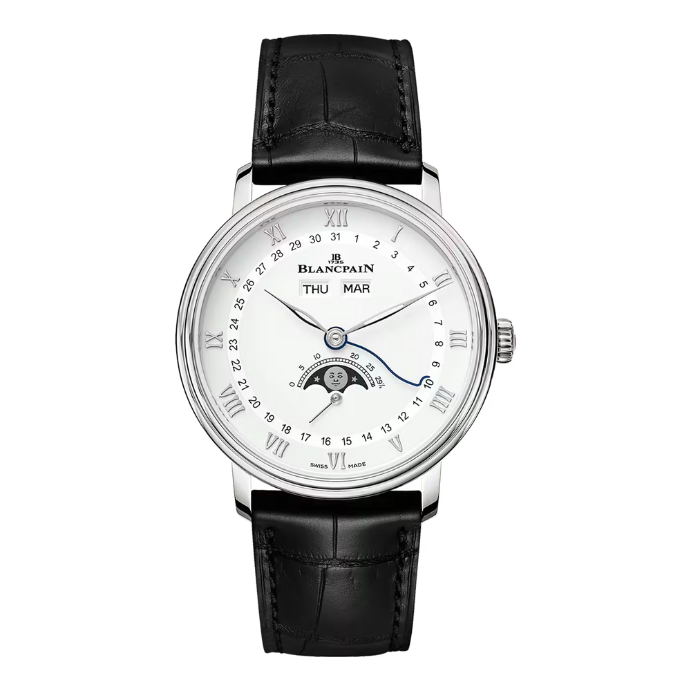 A moon phase complication tracks the 29.5-day lunar cycle with a rotating disc beneath the dial, driven by a 59-tooth wheel. It blends function with poetry. Blancpain is renowned for refining this feature, combining precision, tradition, and elegance in every moonlit display.
